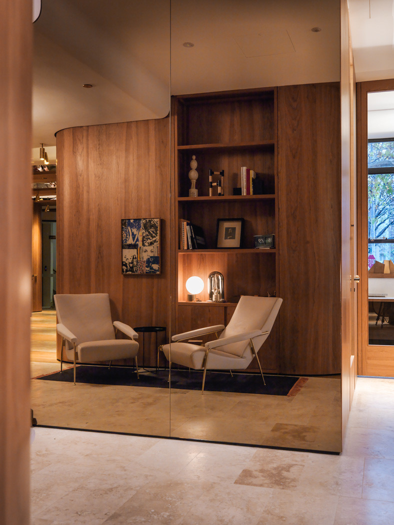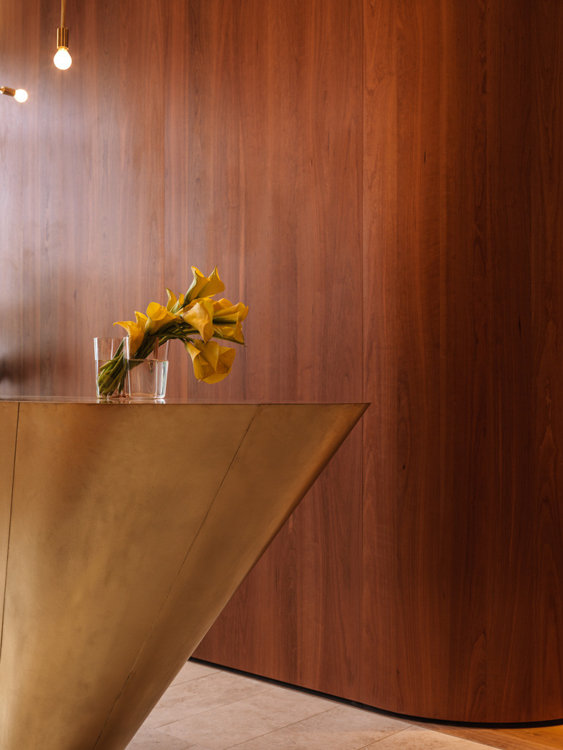 ‘We had a blank canvas to start with, but the building did offer incredible “bones”: a dramatic, curved footplate, 3m ceilings, beautiful brass windows that punctuated the Art Deco façade and the original timber-panelled reception booth,’ says Naomi.