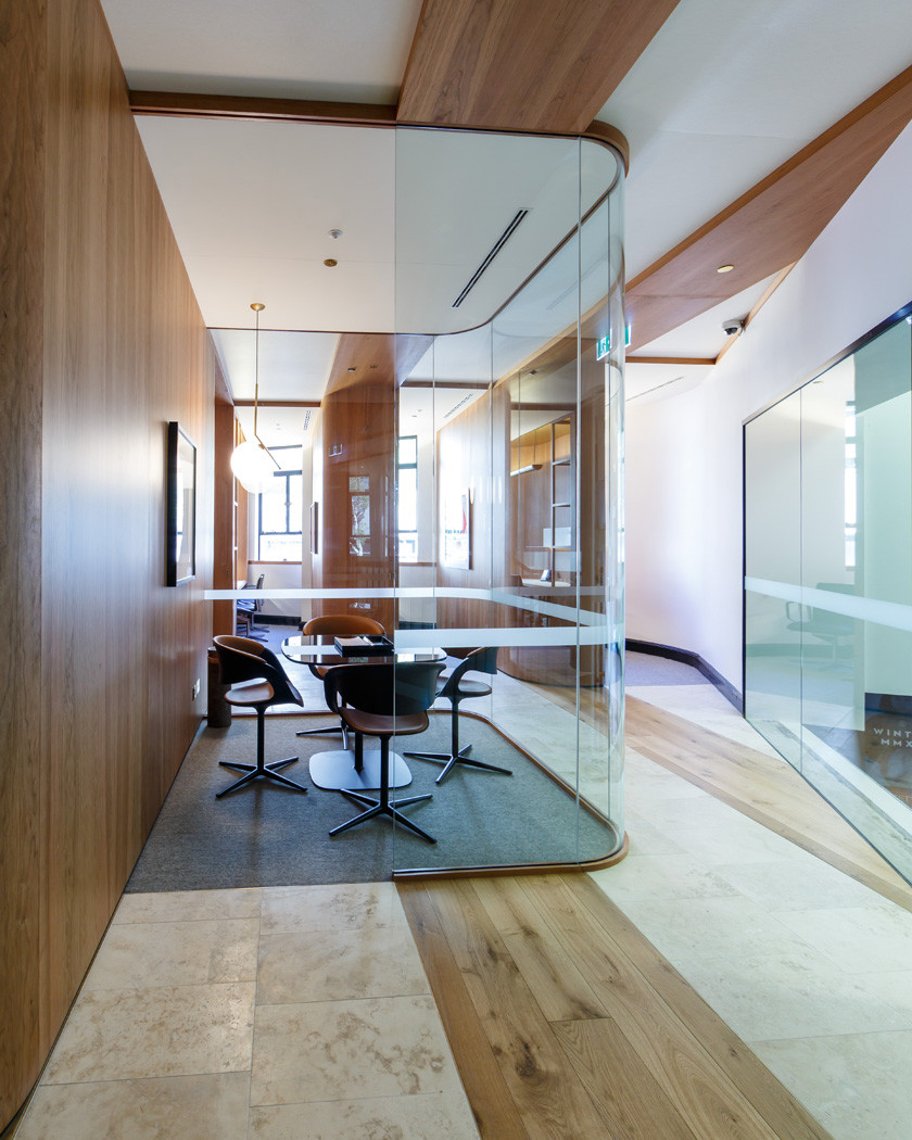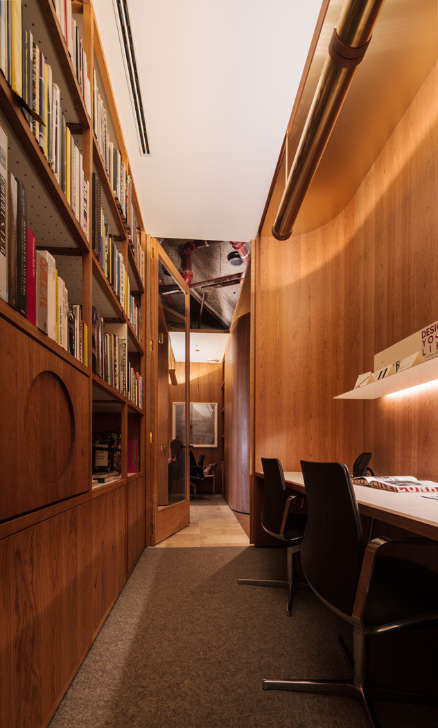 Adds Woods Bagot principal, Domenic Alvaro: ‘The building’s signature form is echoed in the softly-curved handmade timber office suites that wrap around the contour of the floor plate. The intricate three-dimensional feature ceiling of timber and brass links the individual elements within the office, creating a compelling aspect both within and from the street.’