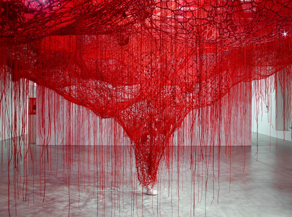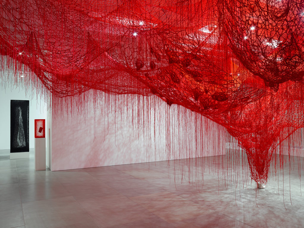 The exhibition is Berlin-based Shiota’s first at the gallery’s London outpost and features an ethereal site-specific installation and sculptures made with her signature blood-red yarn. Shiota has knotted the material to create a colossal net that’s been suspended from the gallery ceiling for the show’s titular piece.