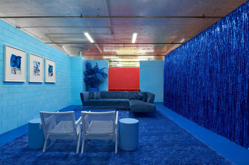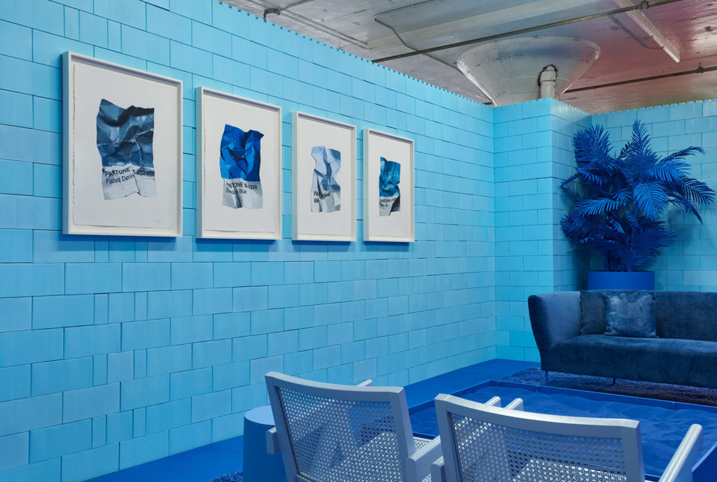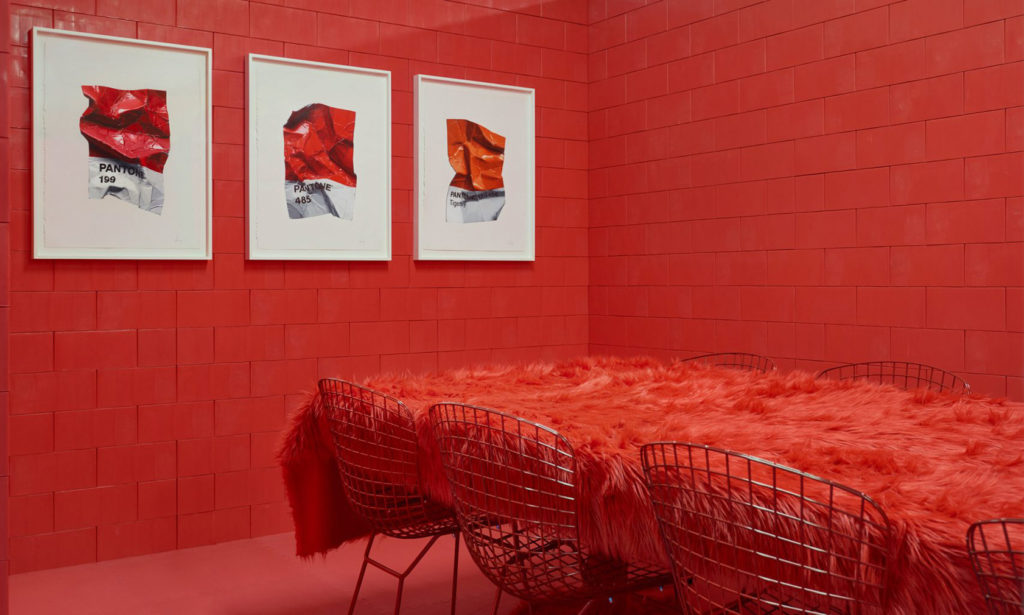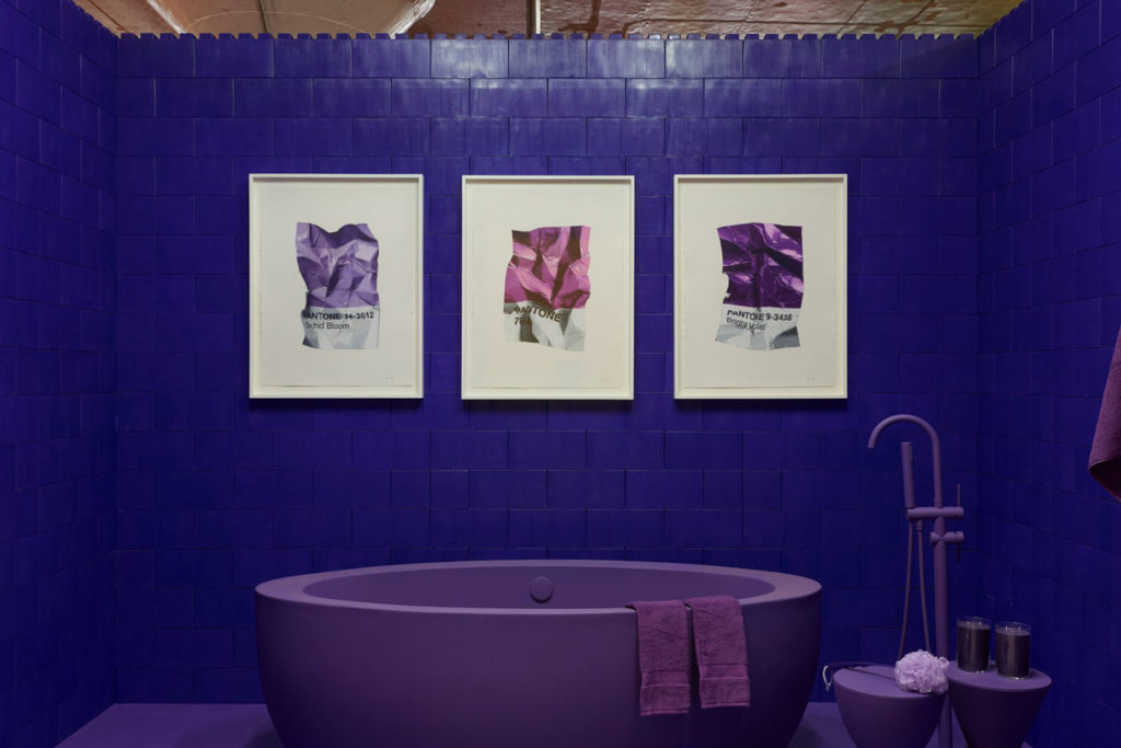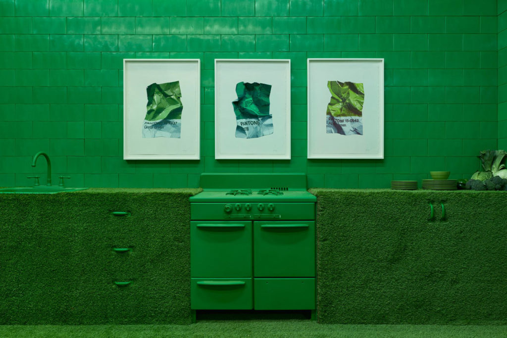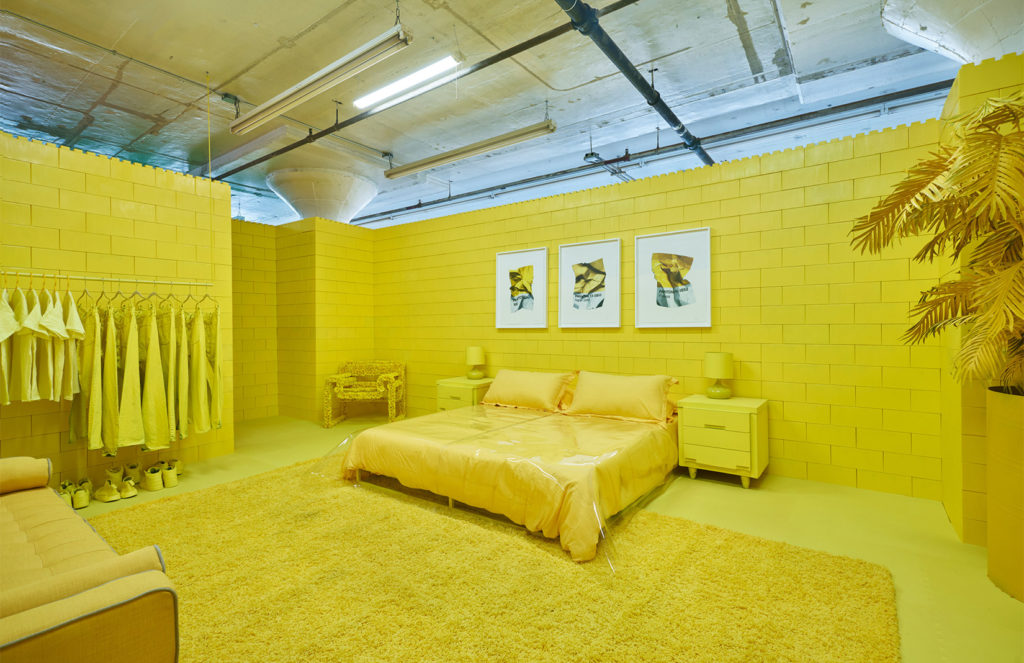 Rooms inside the installation – housed in a 22,000 sq ft industrial space in Greenpoint – include a kitchen, bedroom and living room, made using modular blocks. Artworks feature crumbled Pantone colour squares which pop in their frames against each room’s garish shade, spanning the entire rainbow and applied to every surface.