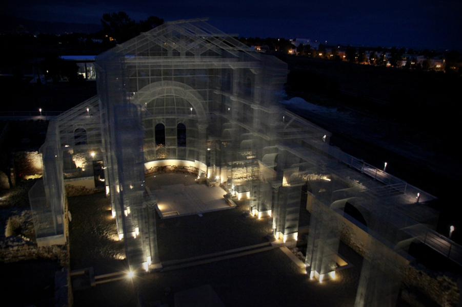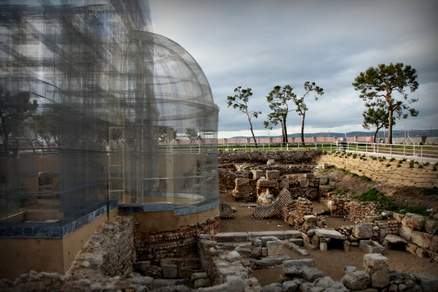 The permanent installation – made from transparent metal wiring – marks the opening of a new archaeological park beside an existing church. Built in three months, the €3.5 million structure corresponds to the original size of the Paleo-Christian basilica that once stood on the site.