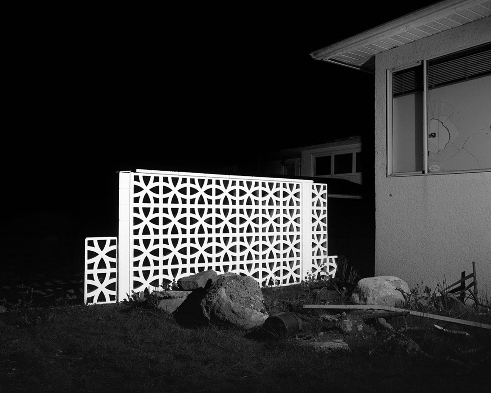 Railings, awnings and door grilles found on typical Canadian suburban homes take on a ghostly glow. Wrapped in Scotchlite reflective tape and illuminated by flash, their fuzzy edges shine like neon strip lights.