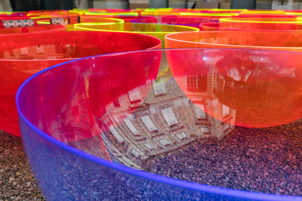 ‘The decision to use bowls was to reflect the stunning architecture in a concave surface,’ explains West. ‘They also double as rain catchers, with the water creating yet another reflective surface for people to view their surroundings. The lens of our eye sees the work in so many different ways, the colour, light, architecture and material work together to create a sensory experience.’