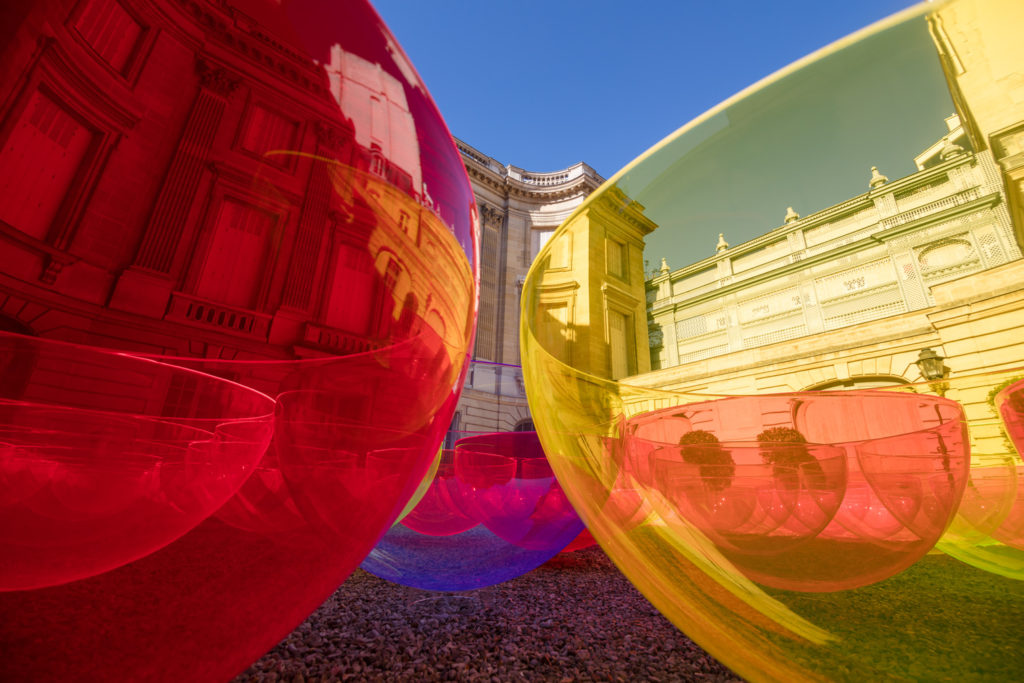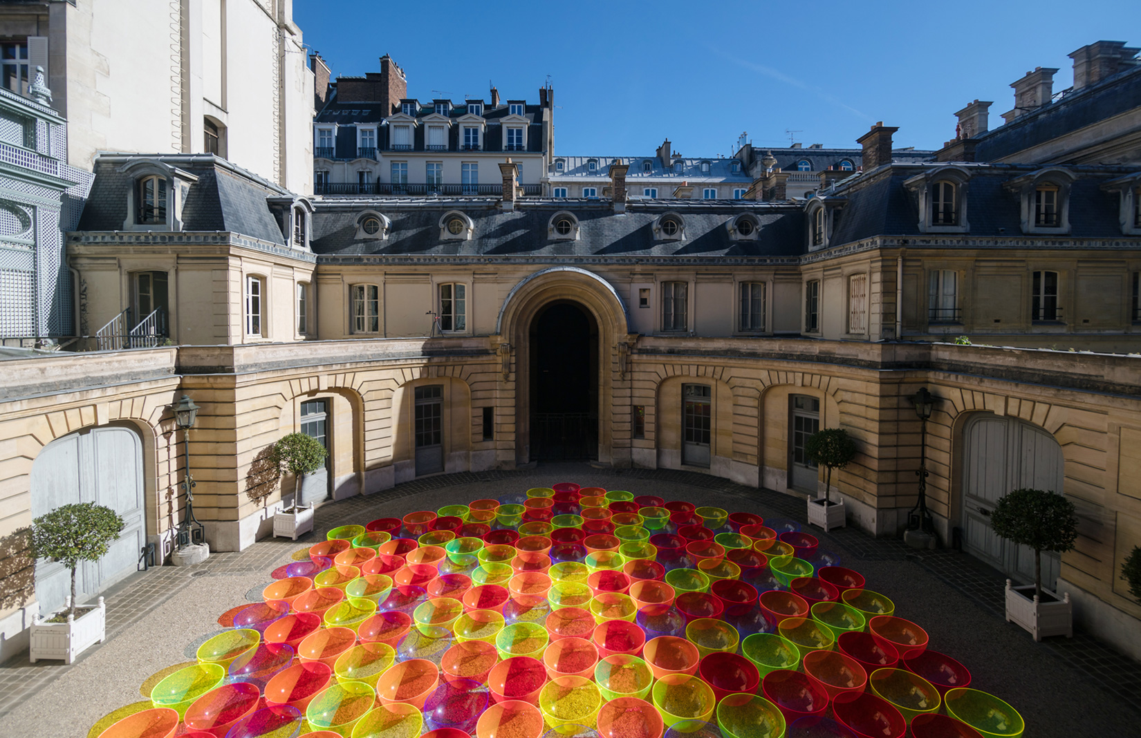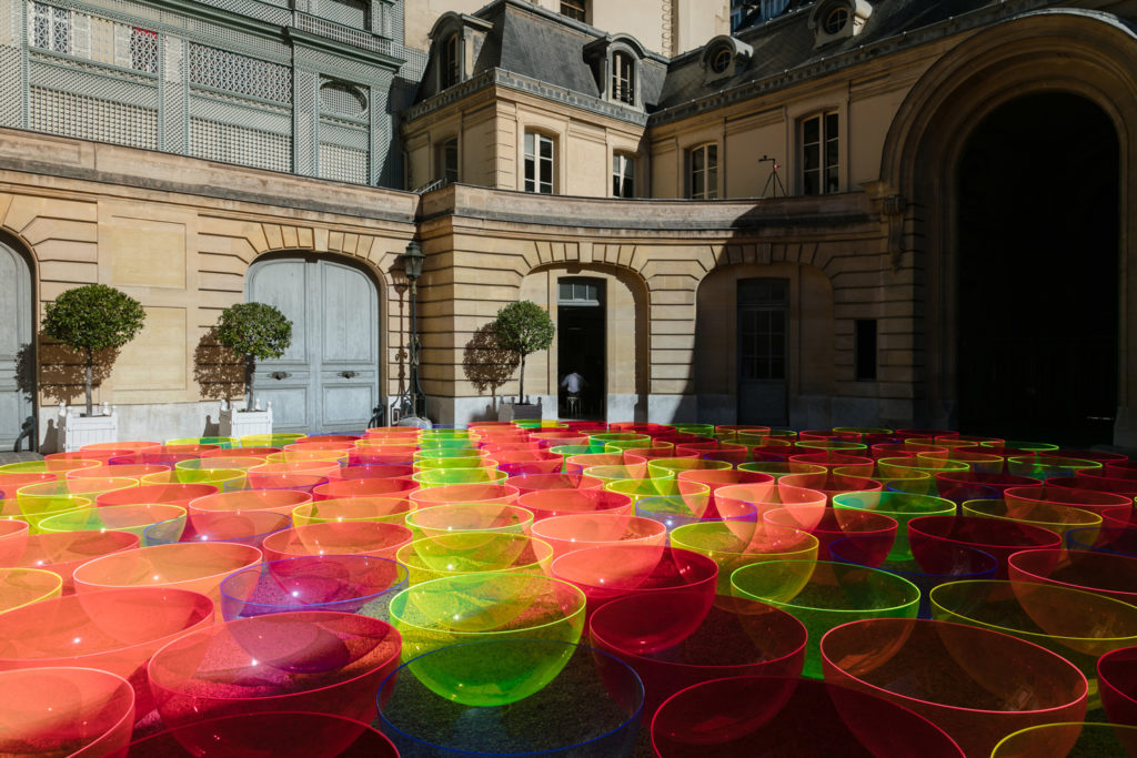 Artist Liz West gave the classical courtyard of Paris’ Museum Nissim de Camondo a neon makeover during fashion week, filling it with 169 ‘glowing’ fluorescent bowls.