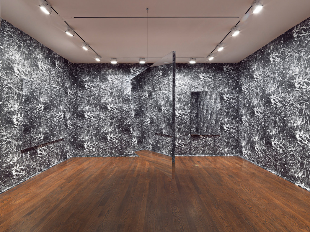 The play of inside and outside becomes both immersive and further complicated on the third floor, where two small rooms have been transformed into cinematic environments. In one, mylar mirrors act as shiny placeholders for windows and doors within a monochrome forest of photo-printed wallpaper. Across the hall, the first room is recapitulated on a suspended screen for a kind of slow-pan mise en abyme that is mesmerizing.