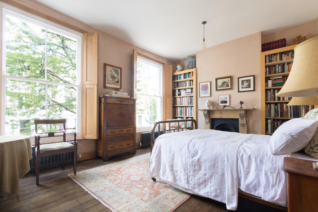 Overlooking the living room is a library filled with bookshelves, and a writing desk with views onto the garden from shuttered picture windows. The master bedroom is also on this level, and the property comes with a private roof terrace.