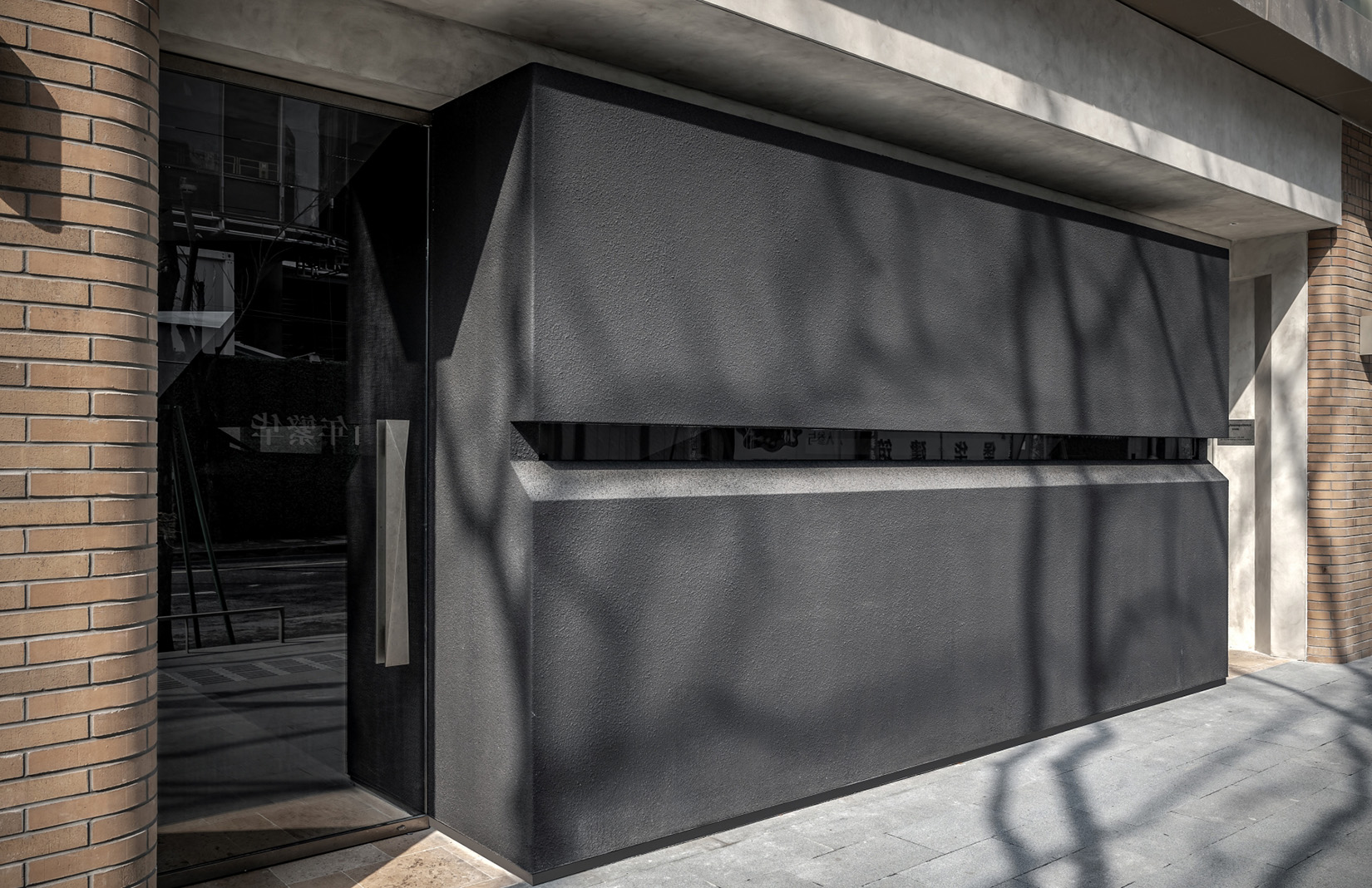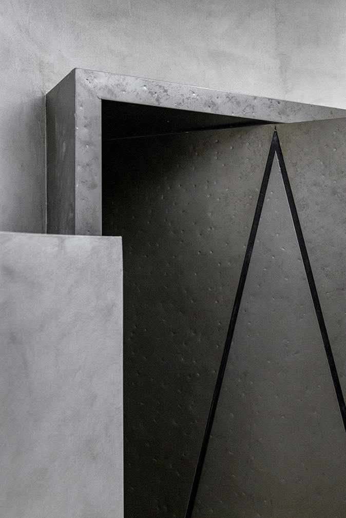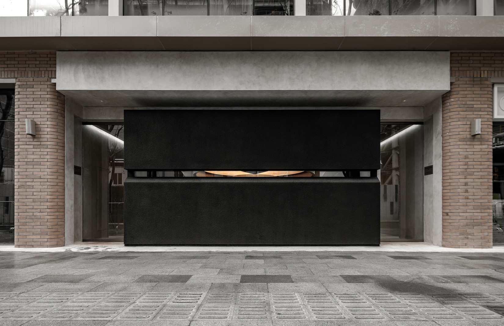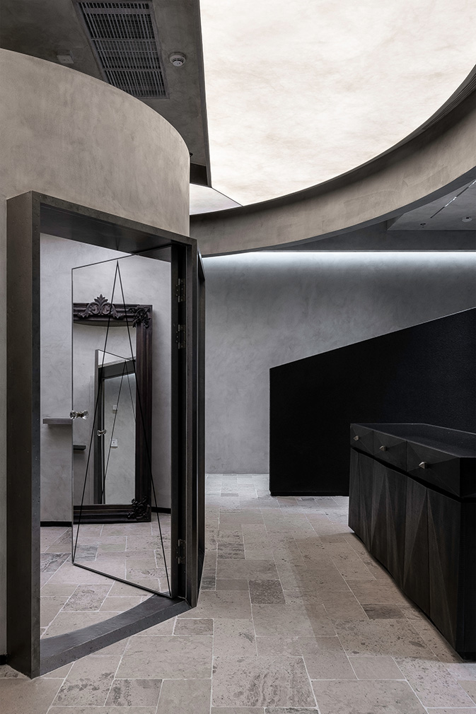 The compact concept store is like a film set shrouded in matt black. The monolithic street-facing entrance opens just a crack to allow a limited flow of light and vision — a Vader-esque reference to fantasy villains. Deep-set glass doors on either side serve as the entrance, ‘turning,’ as they say, ‘the act of entering into a ceremonial, deliberate choice’. The interior unfolds in black and grey micro-cement, blended with black and silver metals. The U-shaped negative space flows around an alien circular structure referred to as the ‘eye’ of the room.