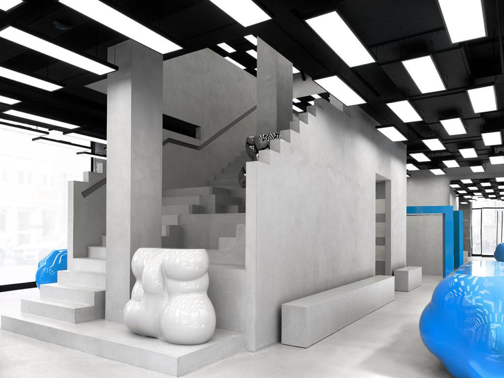 A central concrete staircase anchors the ground floor, its geometric slab steps taking on an MC Escher-like feel. Jesmonite fixtures – coated in high-gloss cerulean and bright green lacquer – act as podiums for footwear and products. Meanwhile, while LED panels cross the blackened ceiling, creating a checker-board effect.