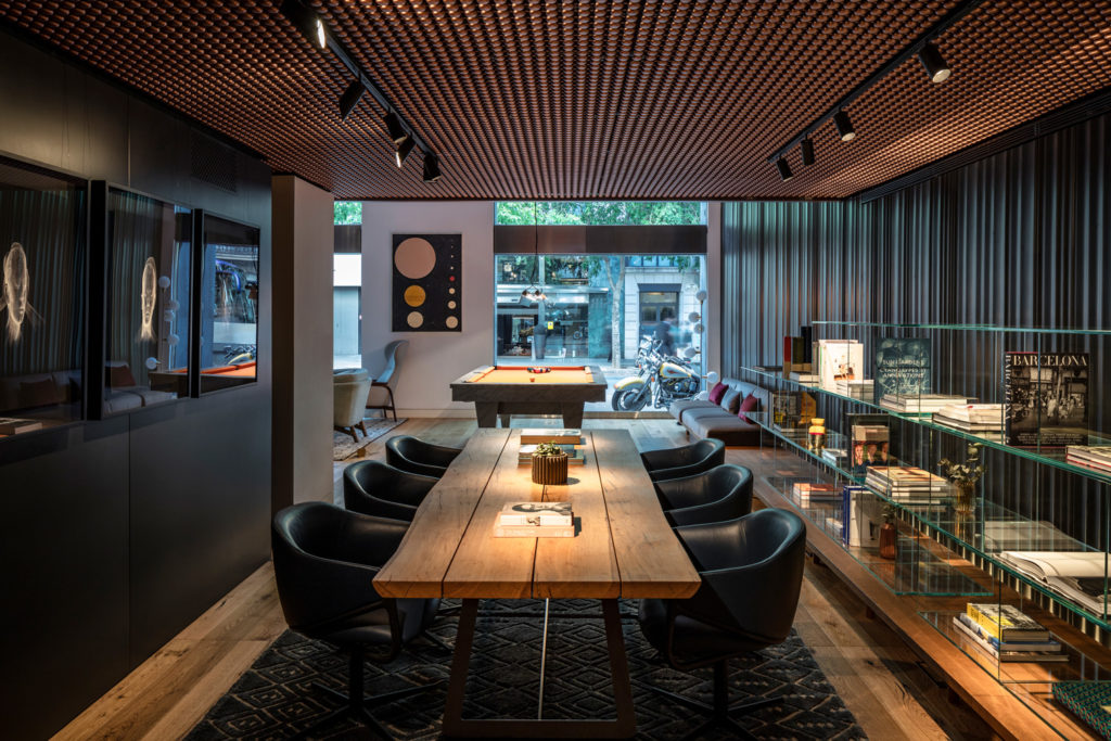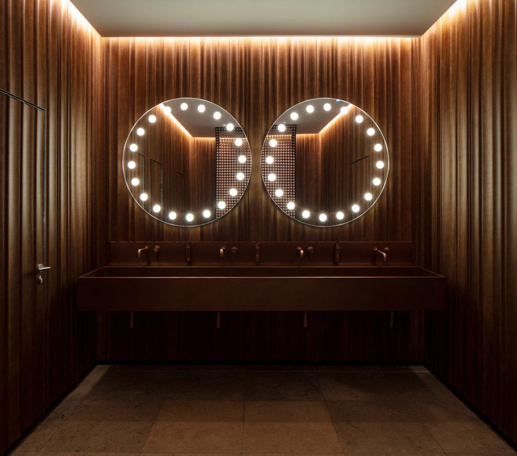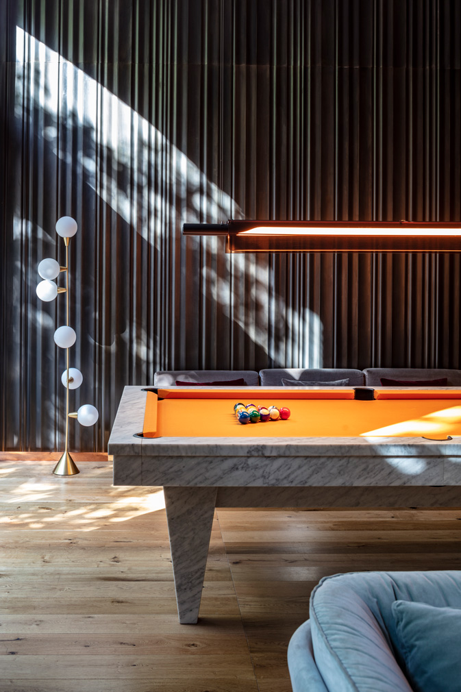 Explains the practice: ‘We came up with the wall in the ground floor: a drapery of steel that’s a soft movement combined with a bold and robust material.’ This multifunctioning level serves as coworking space and creative hub for the local community and features an oversized Carrara marble pool table, oak flooring and suspended, spherical Bocci lighting. Further down, earthy tones create a cosy ambience leading to the MR PORTER restaurant.