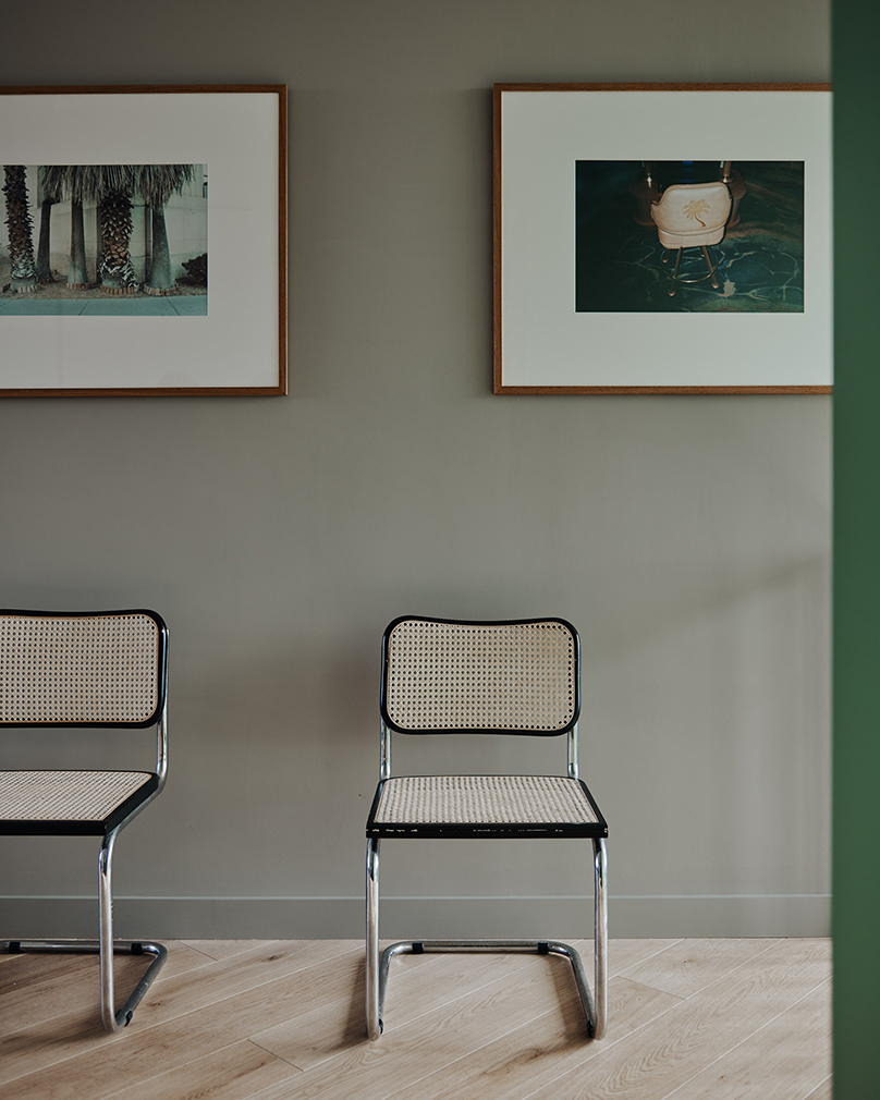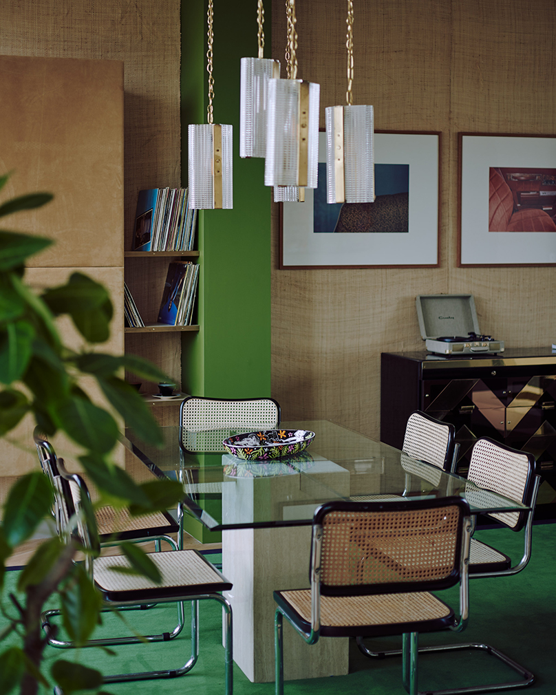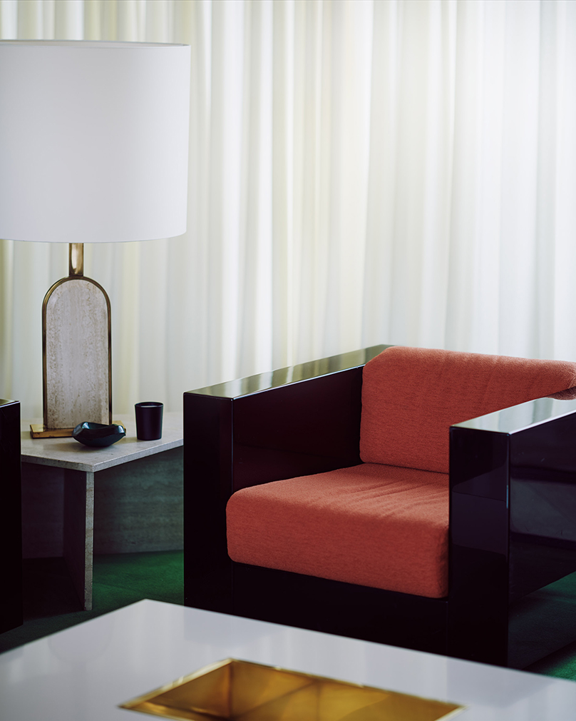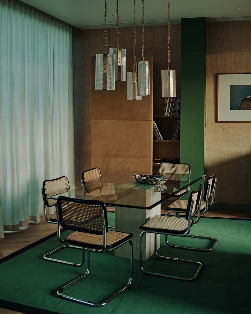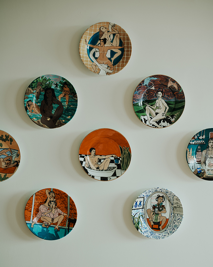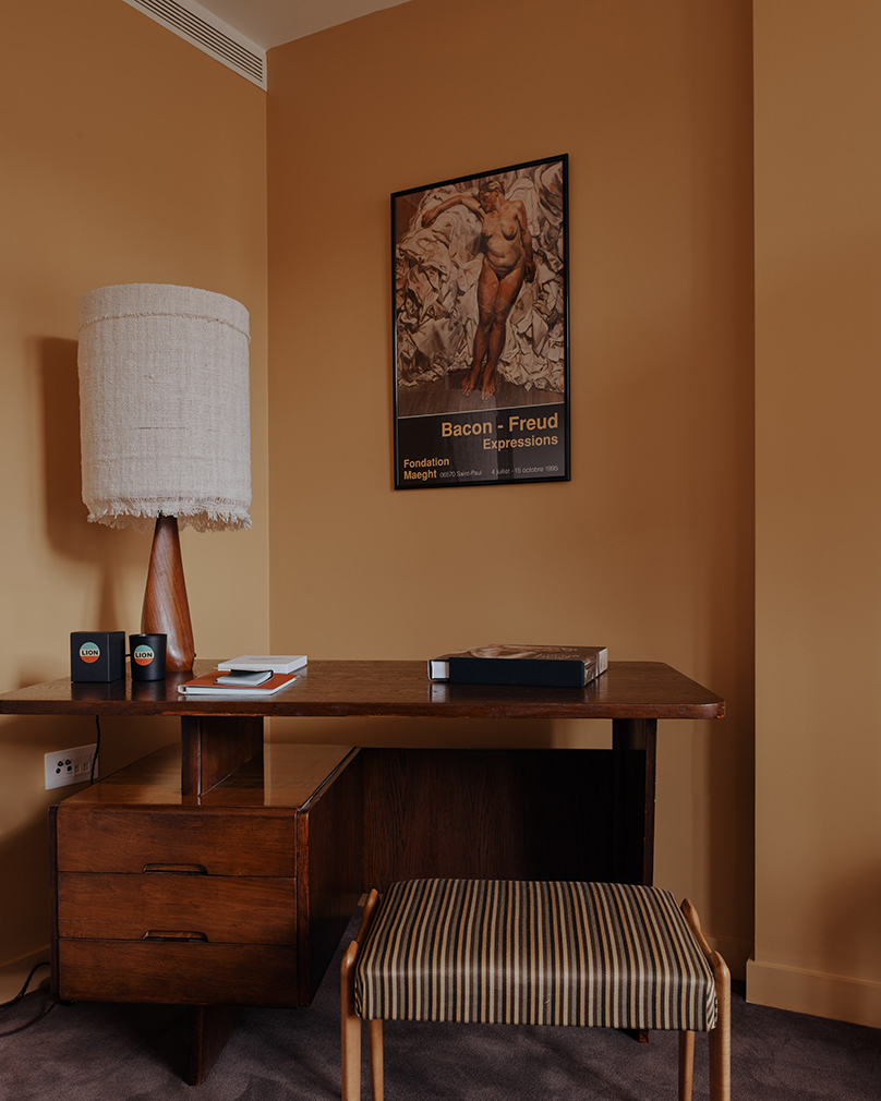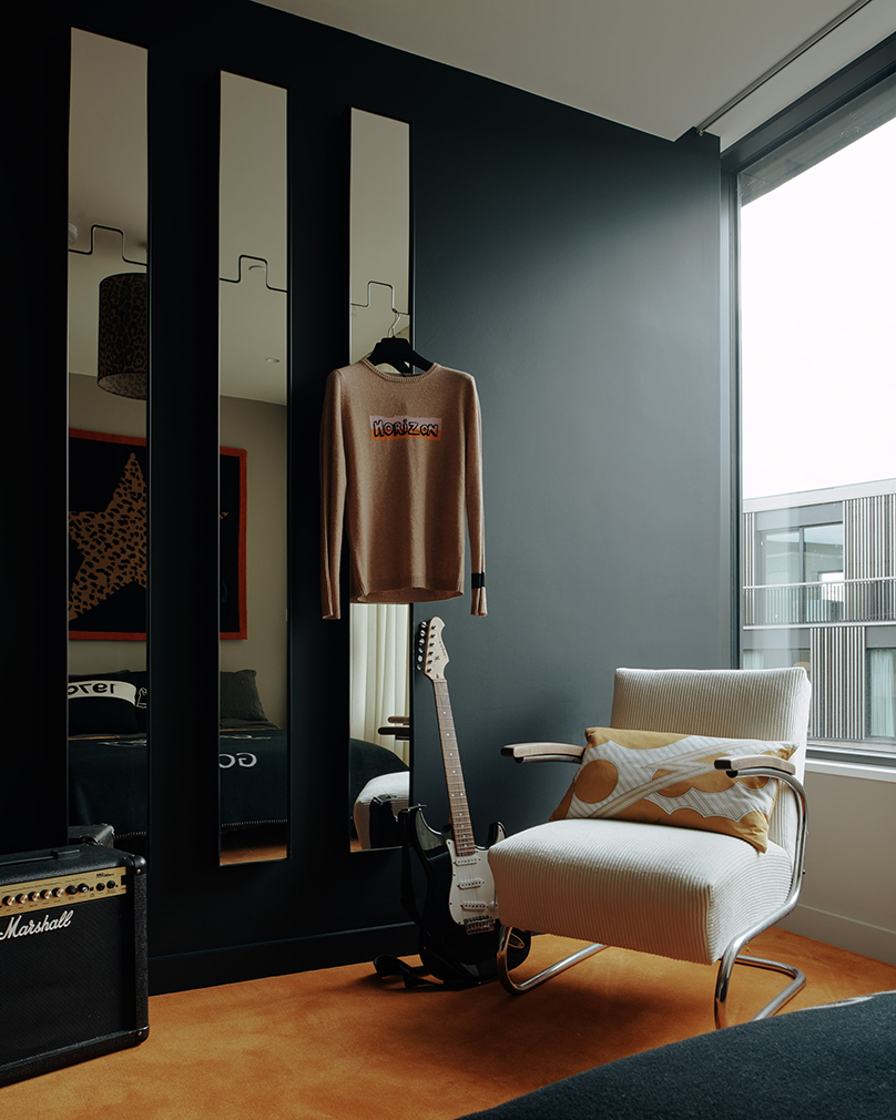 Helios 710, or Bella’s Apartment, features vast windows, wide terraces and a floating staircase. The 2,202 sq ft bolthole is furnished with vintage pieces sourced by Retrouvius as well as wall-hung rugs and bedspreads which duplicate the texts and illustrations found on Freud’s famous knitwear. Subversive ceramic plates by the artist Eliza Hopewell also dot its walls.