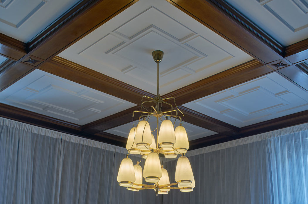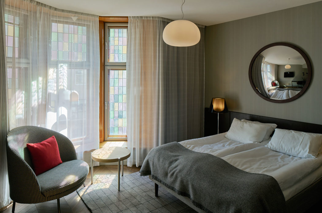 Some of Bergen Børs’s 127 rooms retain their original stained glass windows, while others feature coffered ceilings and parquet flooring. Claesson Koivisto Rune added subtle patterns in the form of pinstriped wallpaper and drapes, houndstooth upholstery, grid-patterned carpet and chequered tiles – as a nod to the suited and booted workers that once occupied the building.