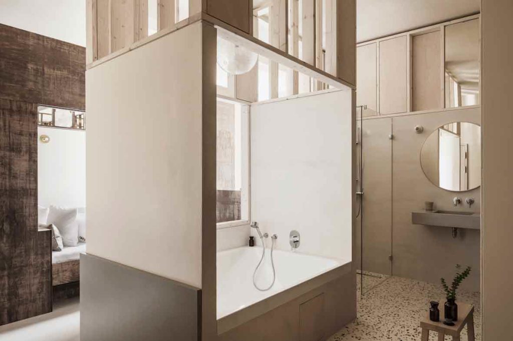 Tuckey has paired wood and concrete inside the suites, using plywood to create shelves and partitions and installing terrazzo for bathroom flooring. Minimal glass light fittings, off-white walls and a touch of grey paint completes the interiors.