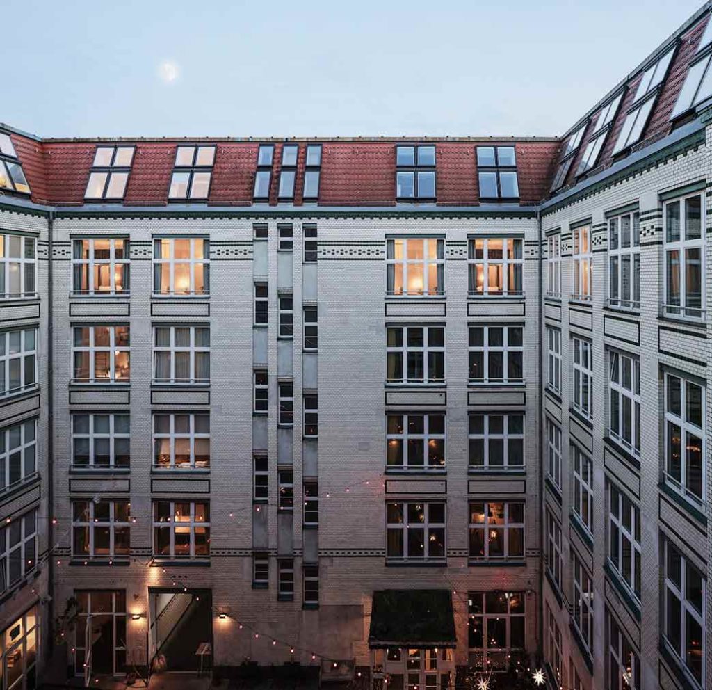 Rooms have floor-to-ceiling windows that look across the courtyard of the Friedrichshain hotel – known for its communal approach to hospitality and connection to the arts community.