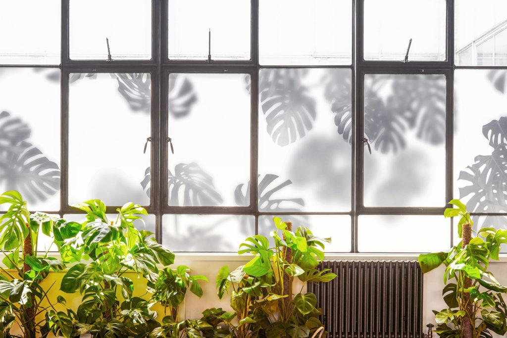 Exposed concrete columns frame workspaces, which look out through Crittal windows patterned with shadowy monstera leaf graphics. Members of the coworking space can shower on-site, and make lunch in the building’s kitchen on the fifth floor – which also leads to a roof terrace.