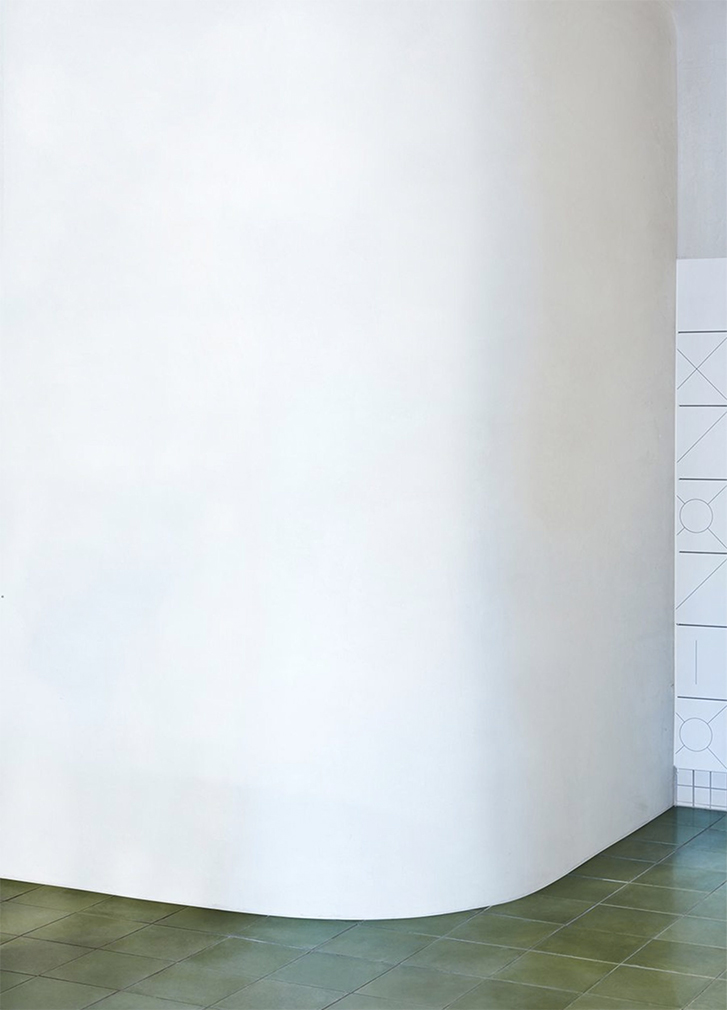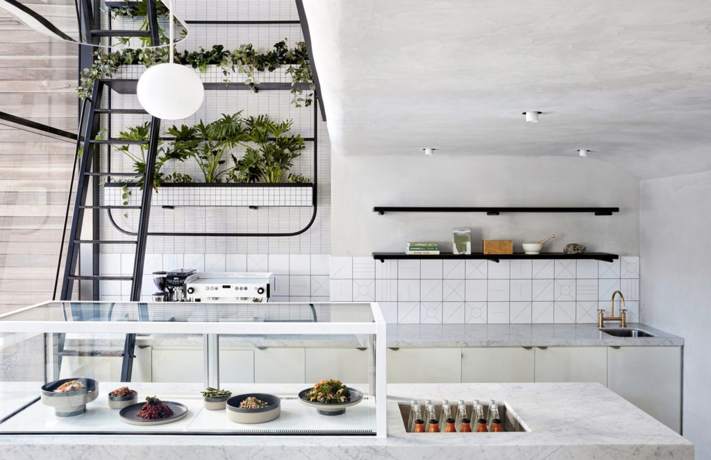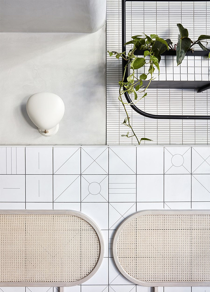 Patterned tiles and white marble frame the counter, and banquette seating with rattan backrests lines the cafe. Hakim borrowed the ‘soft texture and symmetry’ of Syrian architecture, using Tadelakt plaster to add depth to the walls.