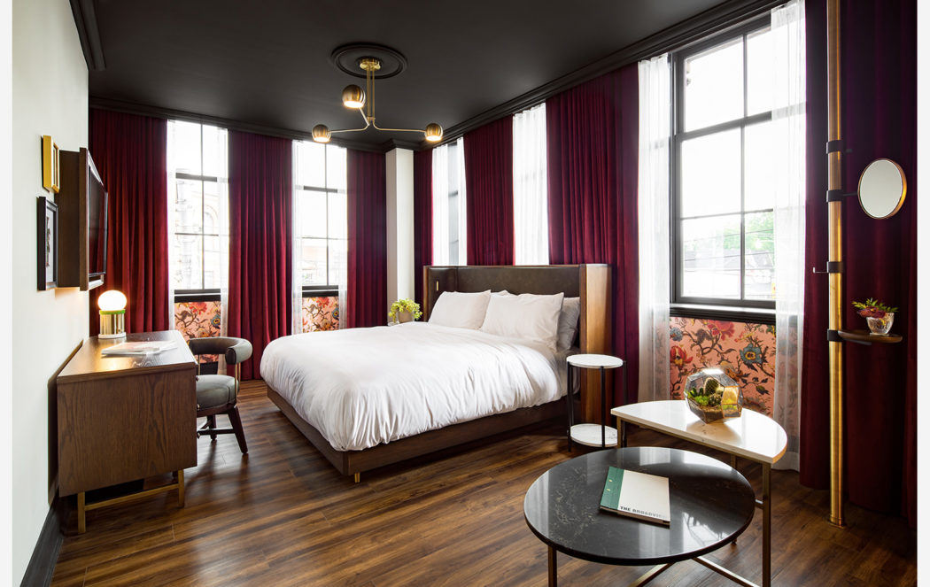 A private-dining space in the original turret has a more vintage feel, with exposed antique brick walls up to the Victorian clerestory windows and rafters. The guest rooms have contemporary brass globe lighting and clean-lined furnishings, but the upholstery nods to old kitsch and the drapes are retro burgundy velvet.