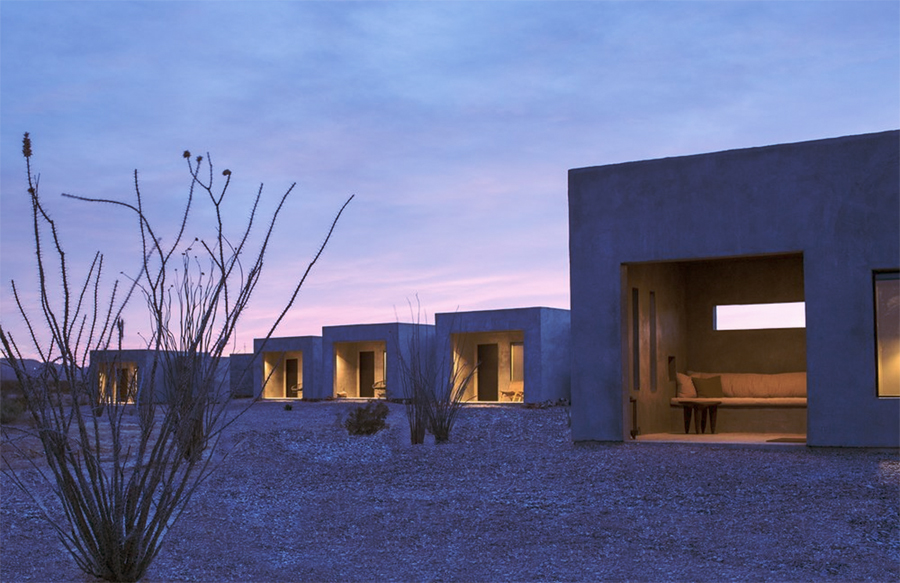 Twelve ultra-minimal concrete casitas nestle into the desert at this Texas retreat, which is situated to make the most of views over the Chisos Mountain Range.