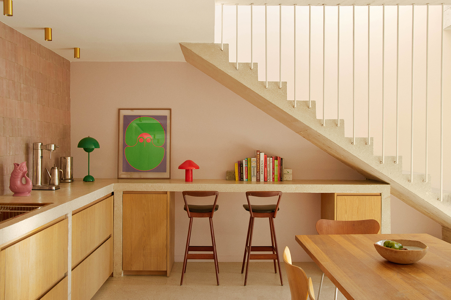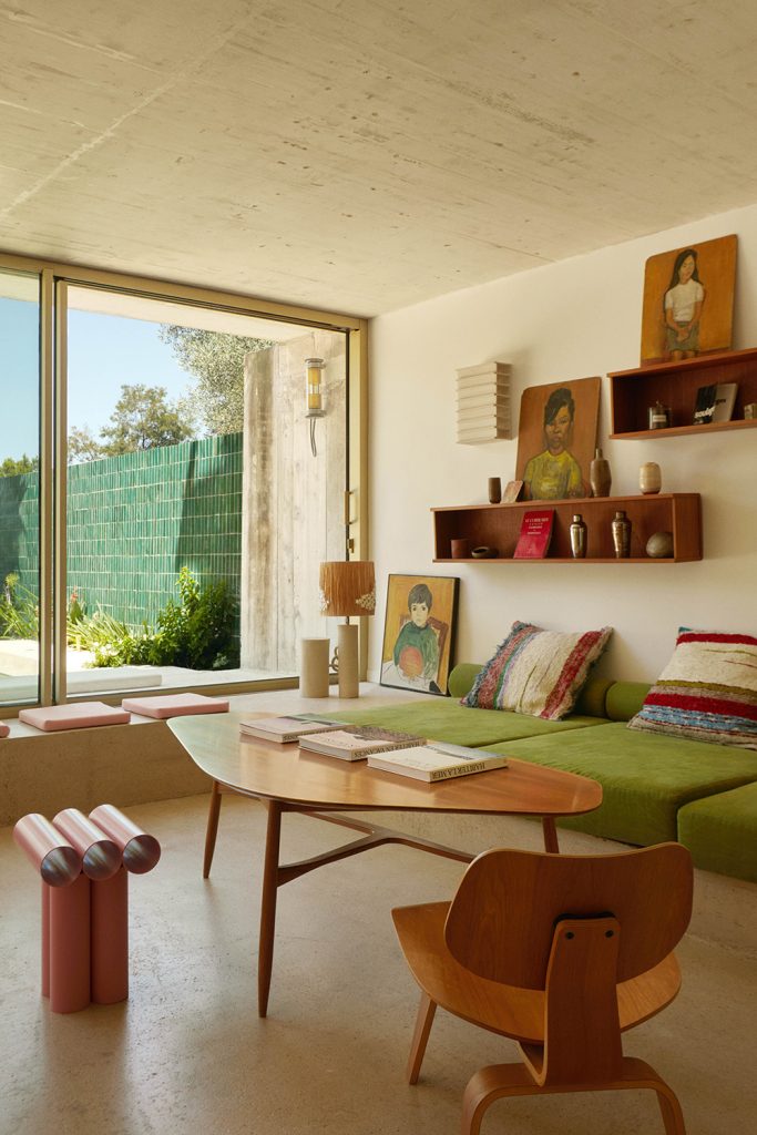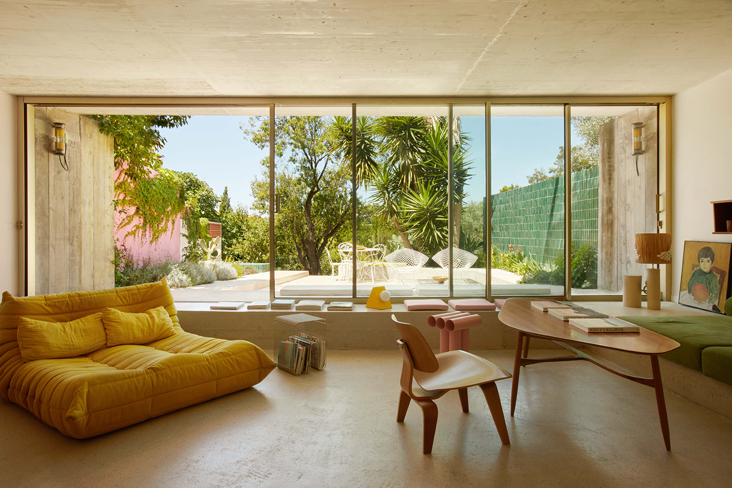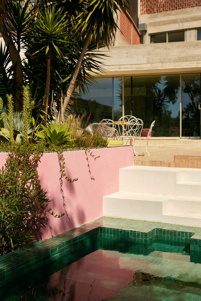 The living areas sit lower in the plan, opening wide to a courtyard framed in pink render, green zelliges and a still pool that acts as a mirror to the surrounding greenery. It’s a pocket of near-tropical colour that sharpens the home’s material expression and anchors it in Marseille’s coastal light.