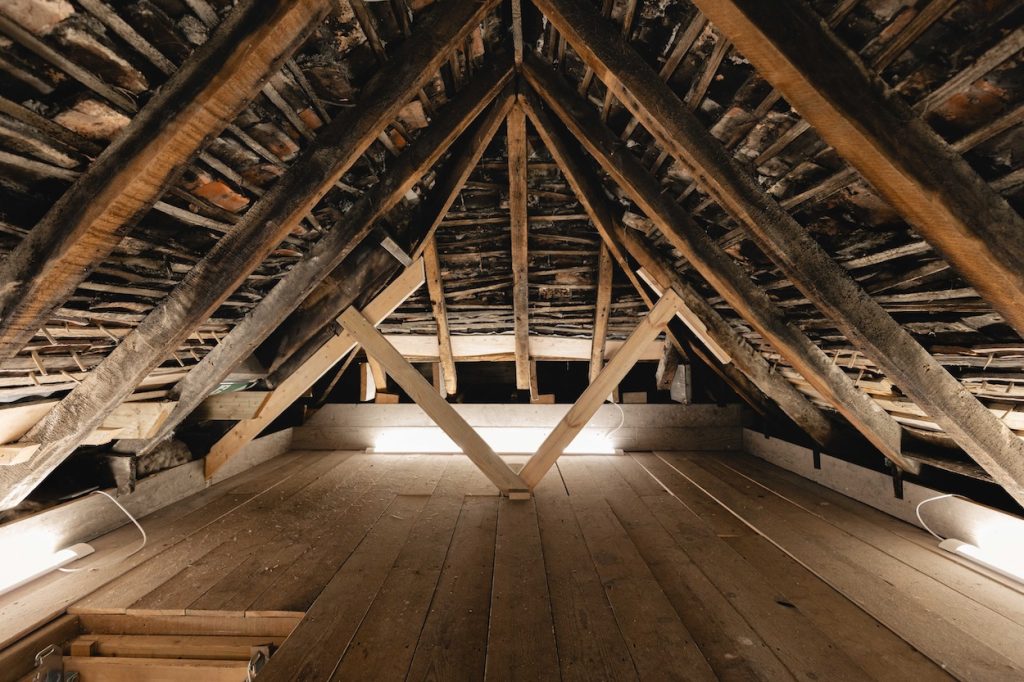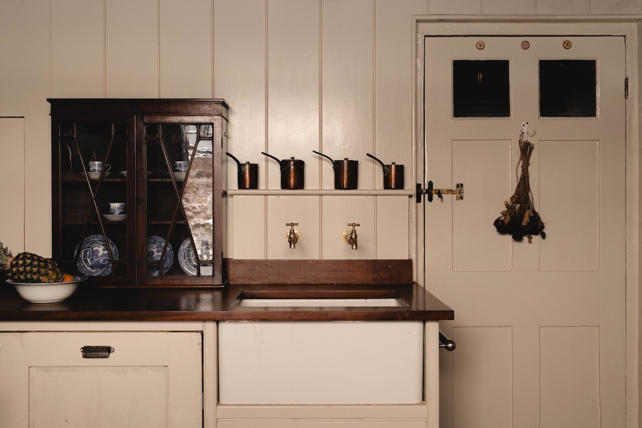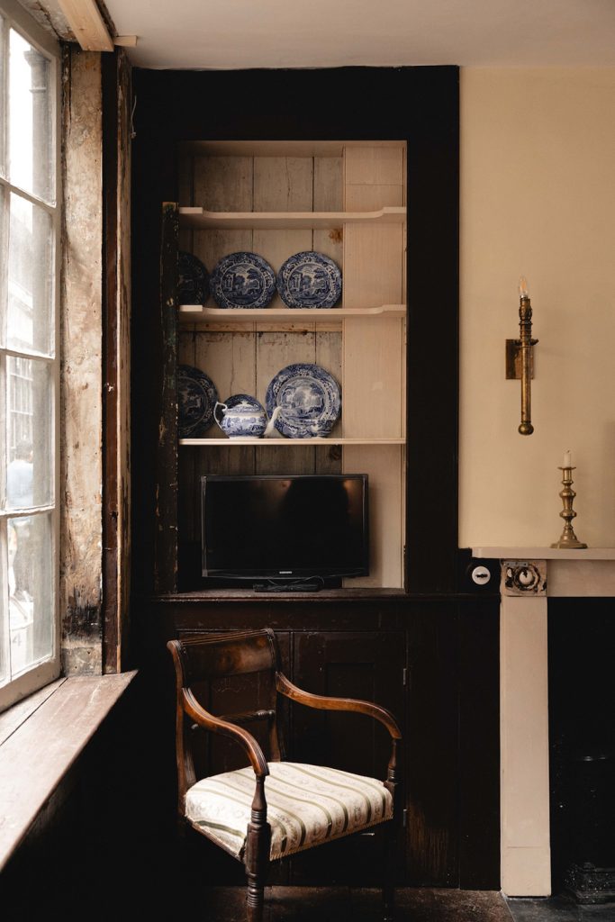 The 1,300sqft property retains its original bow window, wainscot panelling, and hand-carved floorboards worn smooth by centuries of use. Below ground, a York-stone kitchen with a working range recalls the building’s 18th-century life as a haberdashery, while the upper levels feature lime-washed plaster walls, reclaimed timber floors and period fireplaces. The untouched attic, with its pegged roof beams, remains an extraordinary record of early Georgian construction.