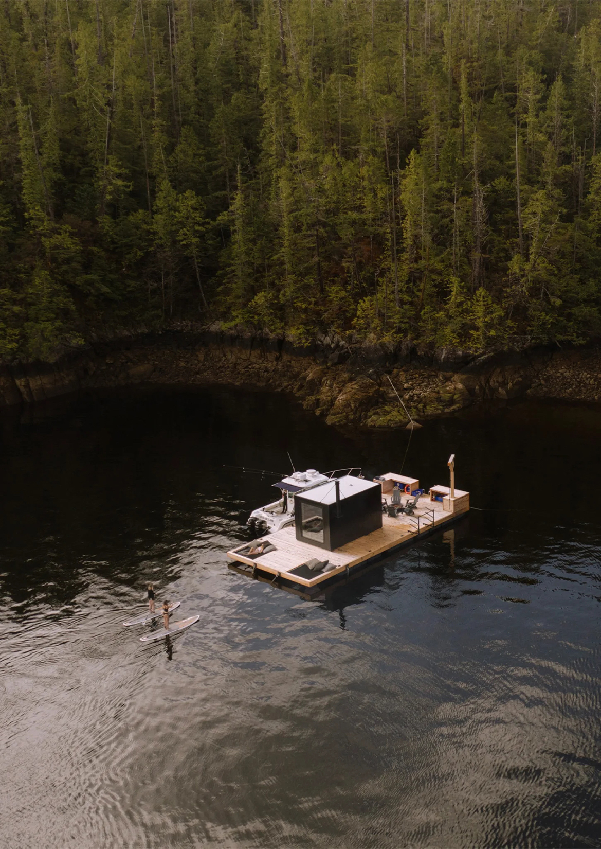 Serenity and solitude overlap at this cedar sauna in the western province of British Columbia. The small wooden cabin, which rests on top of a wooden dock with large windows framing views of the wild, is surrounded both by the water and the forest beyond. Part of Nimmo Bay Wilderness Resort, only accessible by floatplane or helicopter, the cabin adds an additional layer of remote luxury complete with wood stove and paddleboard.