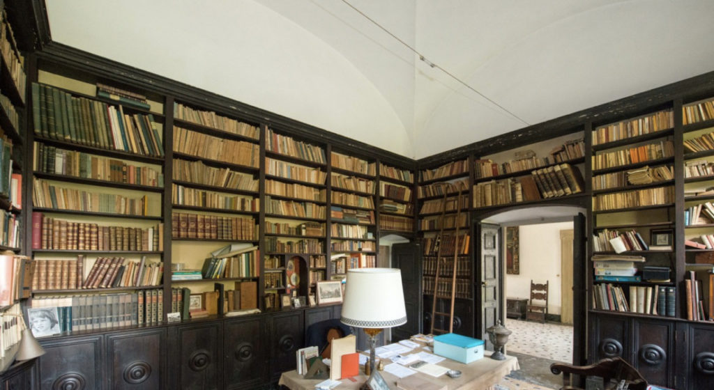 A grand portico leads into the villa’s barrel-vaulted hallway, which is the main artery of the house. The salon and library – which doubles as Mr Perlman’s study in the movie – branch off this central space. Both feature carved stone fireplaces, while the library has tall, carved bookcases, and flocked period wallpaper.