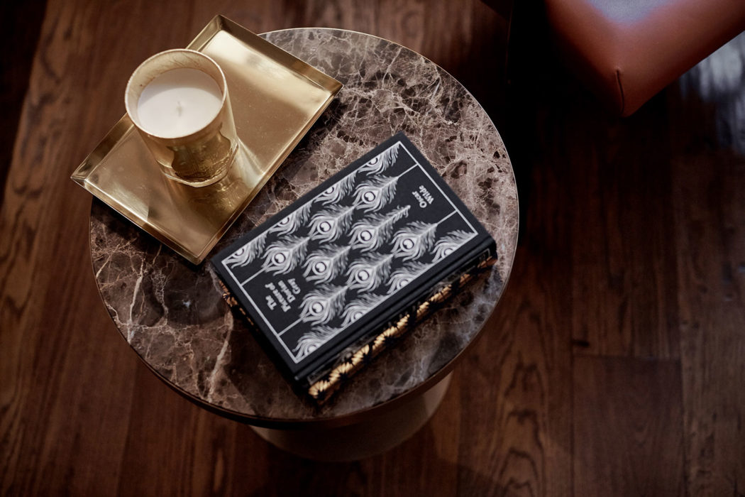 Rooms feature dark wood detailing, brass accents, and locally-made framed lacework and textiles, as well as bespoke pendants designed by the studio.