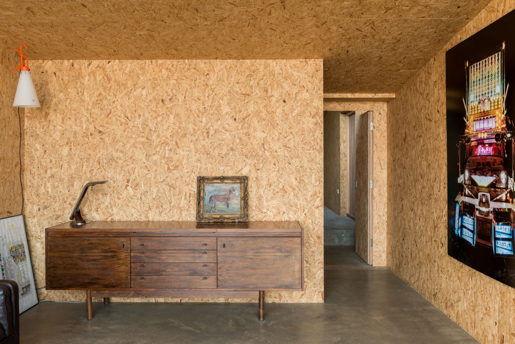 The first floor houses the kitchen (custom designed by Turner) as well as a dining area and a large living room, and features poured concrete floors, bespoke plywood furniture and fittings, and a brick chimney with a wood-burning stove. Four bedrooms fill the ground floor, each with exposed beamed ceilings and painted brick walls.
