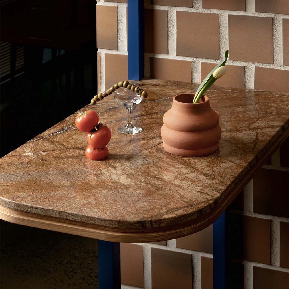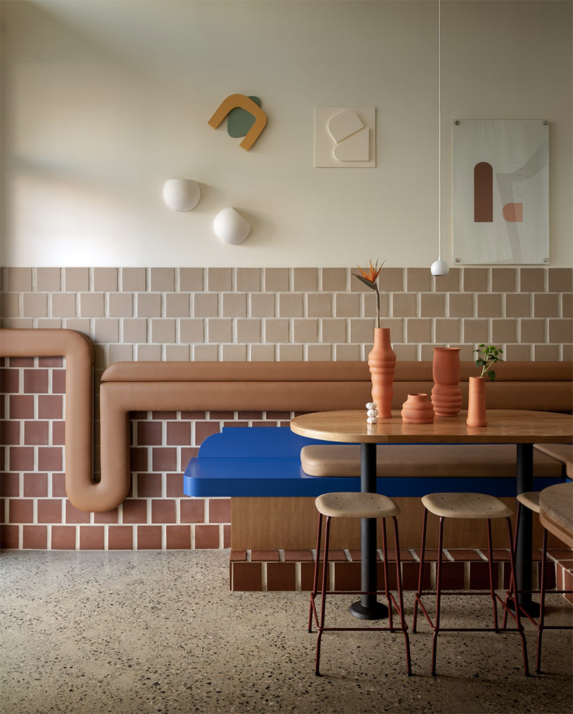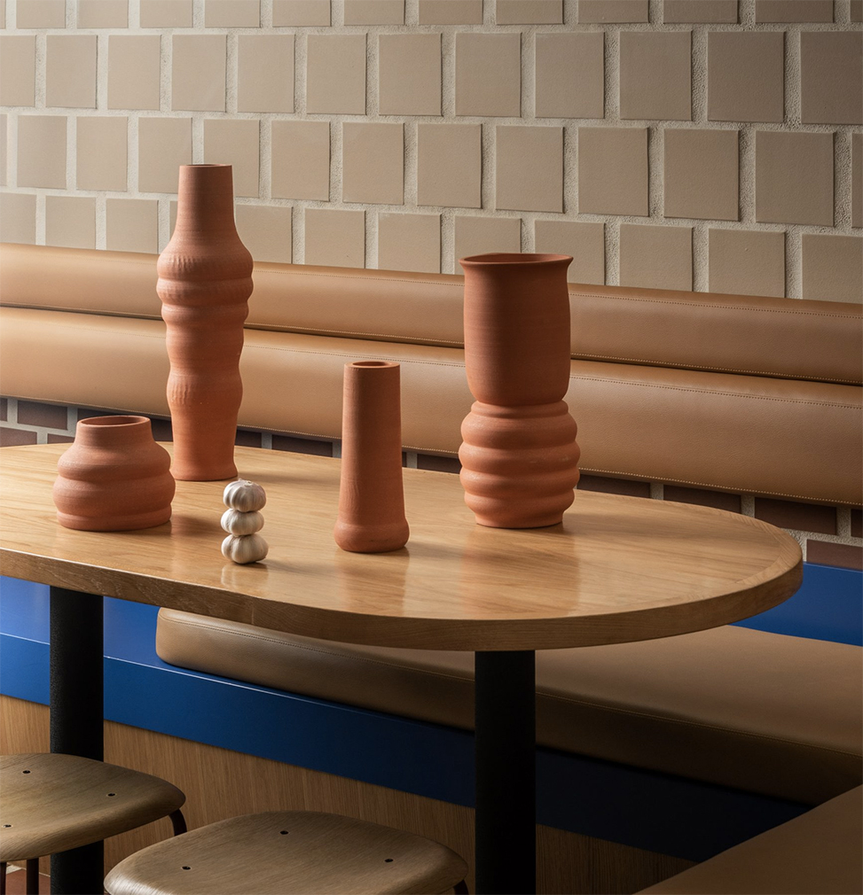 The restaurant interiors are by local studio Ste Marie; it took cues from the Jardins de les 3 Xemeneies in the Catalan capital. The terracotta-coloured exterior of the park’s three brick chimneys is reflected not only on the tiles that line the Vancouver restaurant’s walls but also the brown marble tabletops and leather benches.