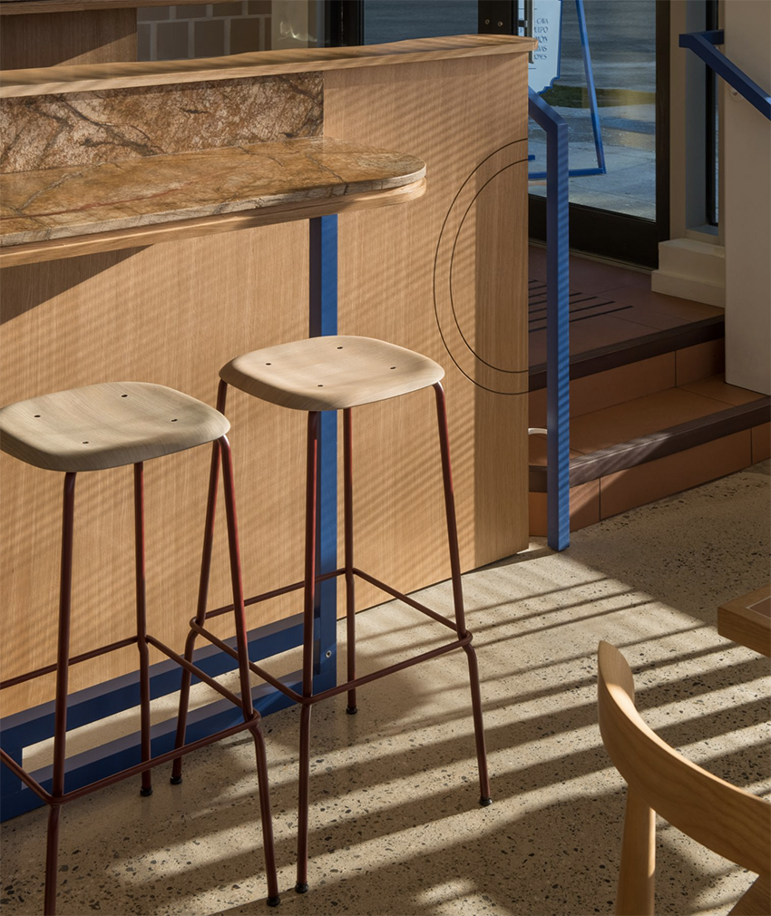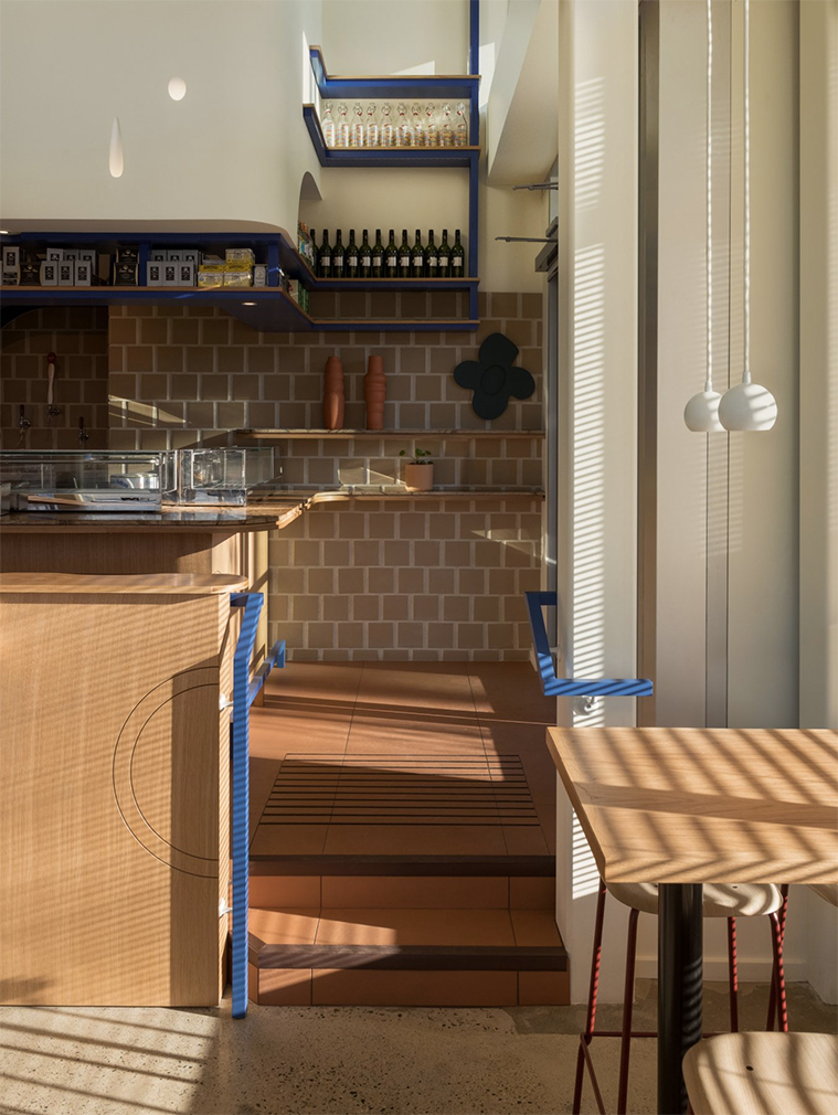 To further liven up the muted tones, Ste Marie added elements in a Joan Miró-esque cobalt blue, splashing it across seats, shelves and handrails.
