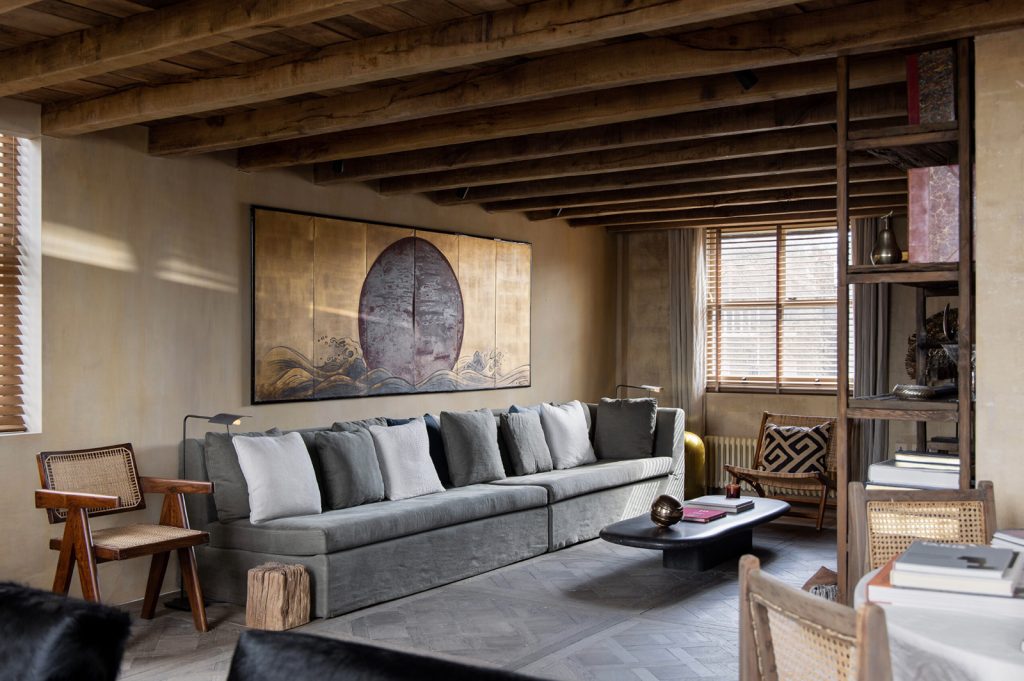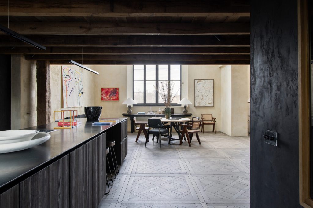 Vaulted ceilings and low-slung beams give the 2,042sqft plan a near-civic scale, softened by yellow-toned lime plaster and inky black walls. The main reception level wraps around the volume in a horseshoe arrangement, creating a sequence of interconnected rooms. Light enters through double-height windows that rise into the eaves, washing across a kitchen anchored by a monolithic marble and timber Boffi island. Elsewhere, Parquet de Versailles flooring sourced from Belgium and matt-black Dornbracht fittings bring tactility and weight.