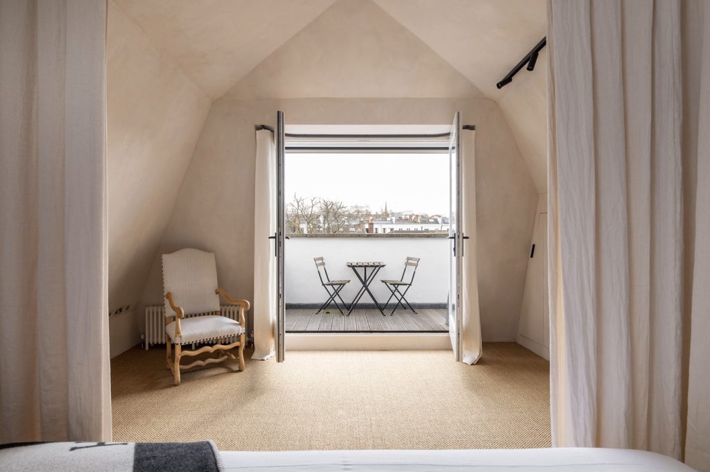 Two calm bedrooms sit apart from the main living spaces, each with an en suite bathroom and access to a private terrace overlooking the Notting Hill roofscape. The principal suite pairs a vaulted ceiling with a skylit bathroom, while the guest room introduces fitted storage and a hessian carpet. The apartment is available for long or short let, priced from £6,000 per week through Domus Nova.