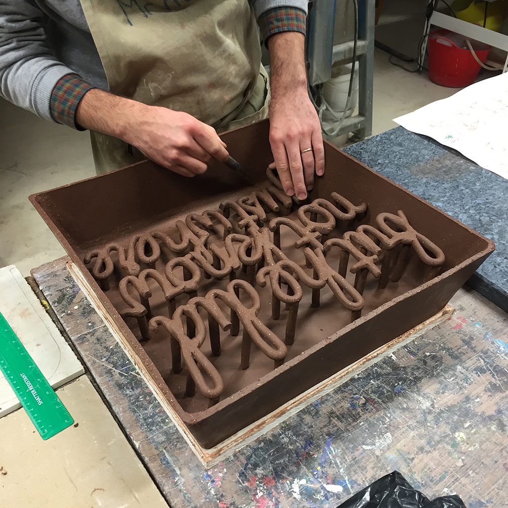 Pictured: Ceramicist Matthew Raw making his artwork, ‘Panel Discussion’. Photography: Marina Castagna