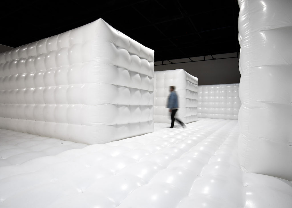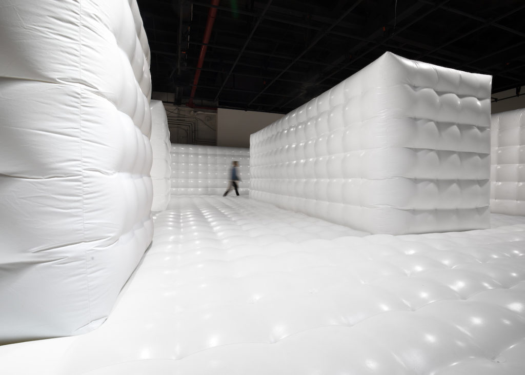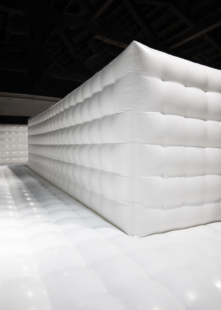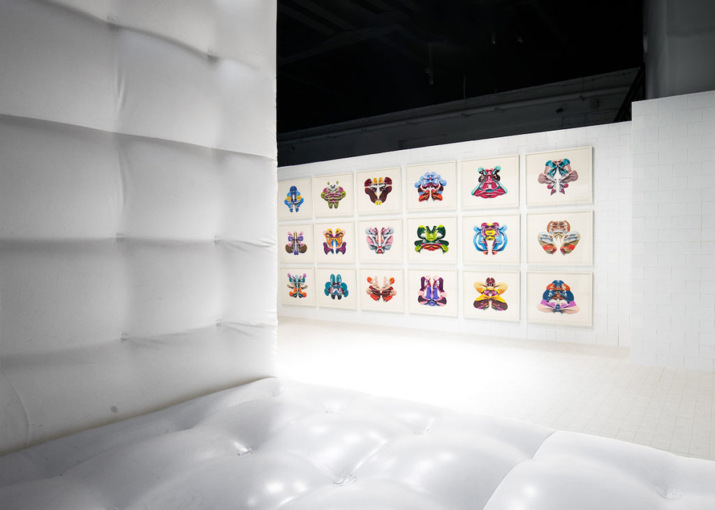Rorschach takes over a 3,000 ft warehouse in Dumbo and sees pencil studies inspired by the psychological inkblot test mounted on the walls of the inflatable structure. It was sewn specially for the exhibition over 12 months, and visitors must bounce their way through the labyrinthine maze – whose padded walls evoke those found in the rooms of psychiatric units – to reach them.