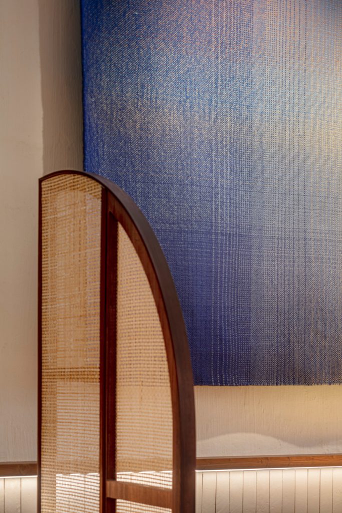 El Equipo Creativo designed the space, which is located in the city’s Eixample district and is the second Compartir to open in Spain – with the first established in the coastal town of Cadaqués. The studio installed three ‘blue windows’ in the restaurant, collaborating with a different local artist to create a textile, sculptural and pictorial interpretation for each. The sea-coloured palette is picked up elsewhere at Compartir in the form of a bright blue door.