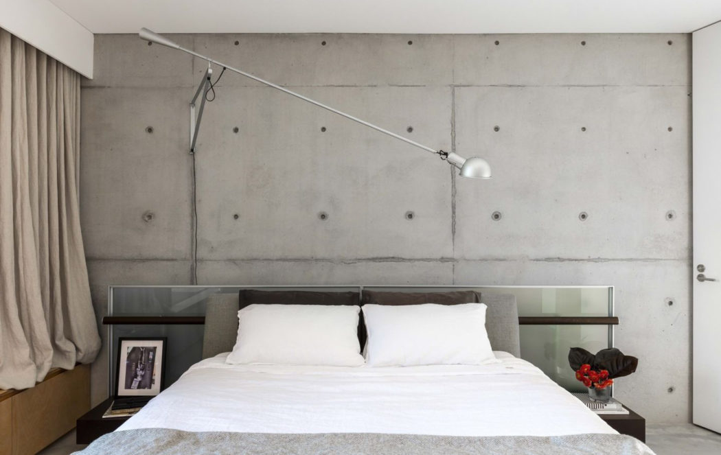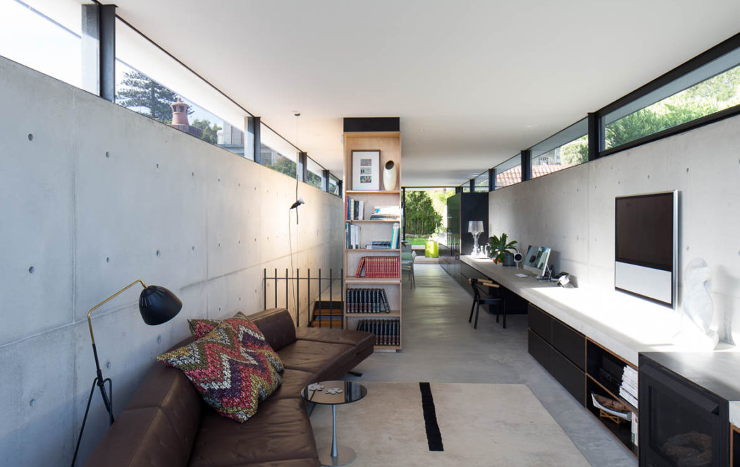Glass windows ribbon around the top of the concrete walls above eye-level to let light into the living spaces, while hiding inhabitants from prying eyes. These ‘simple, rugged, no-fuss living’ spaces feature raw concrete, plywood and plate steel throughout.