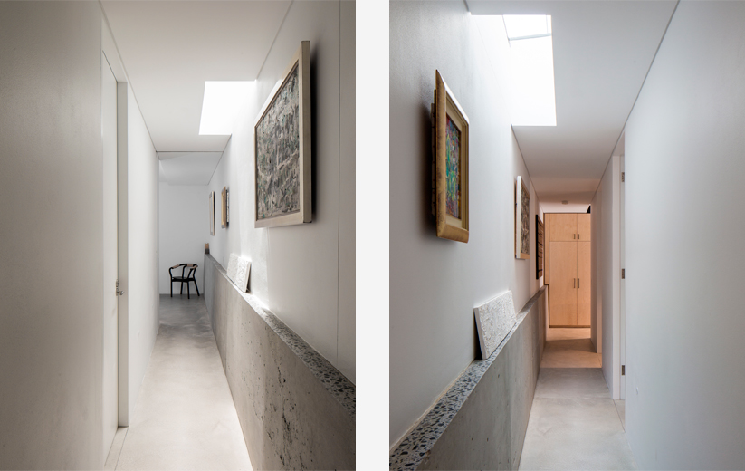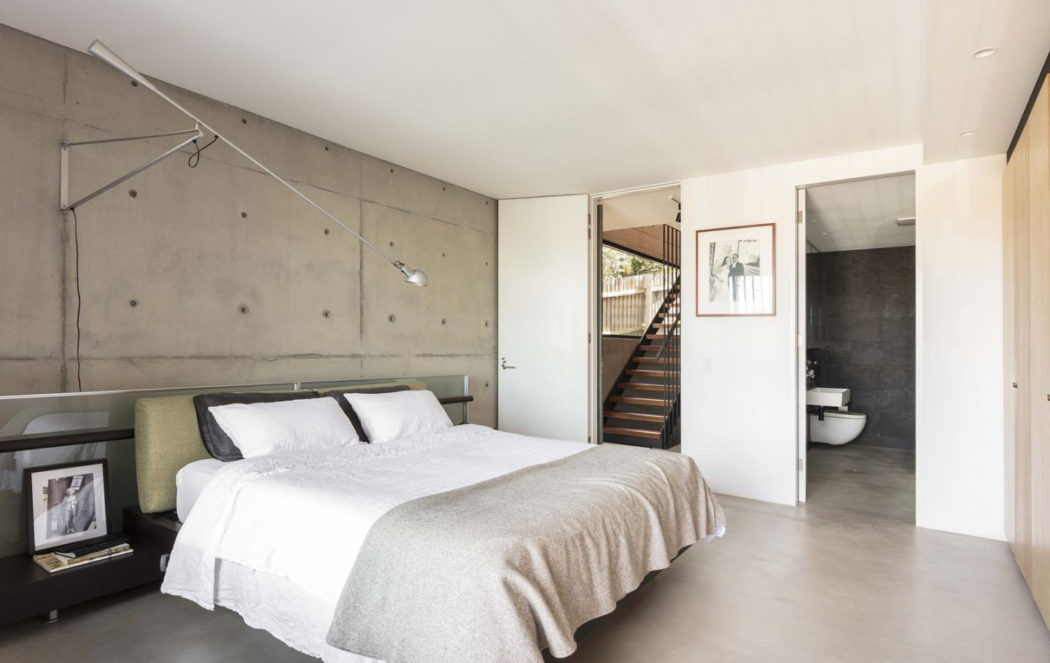 Three bedrooms fill the ground floor level which is accessed by a steel staircase – painted in the paint used on the Sydney Harbour Bridge, according to Architectureau. Its strung form also echoes the property’s façade.