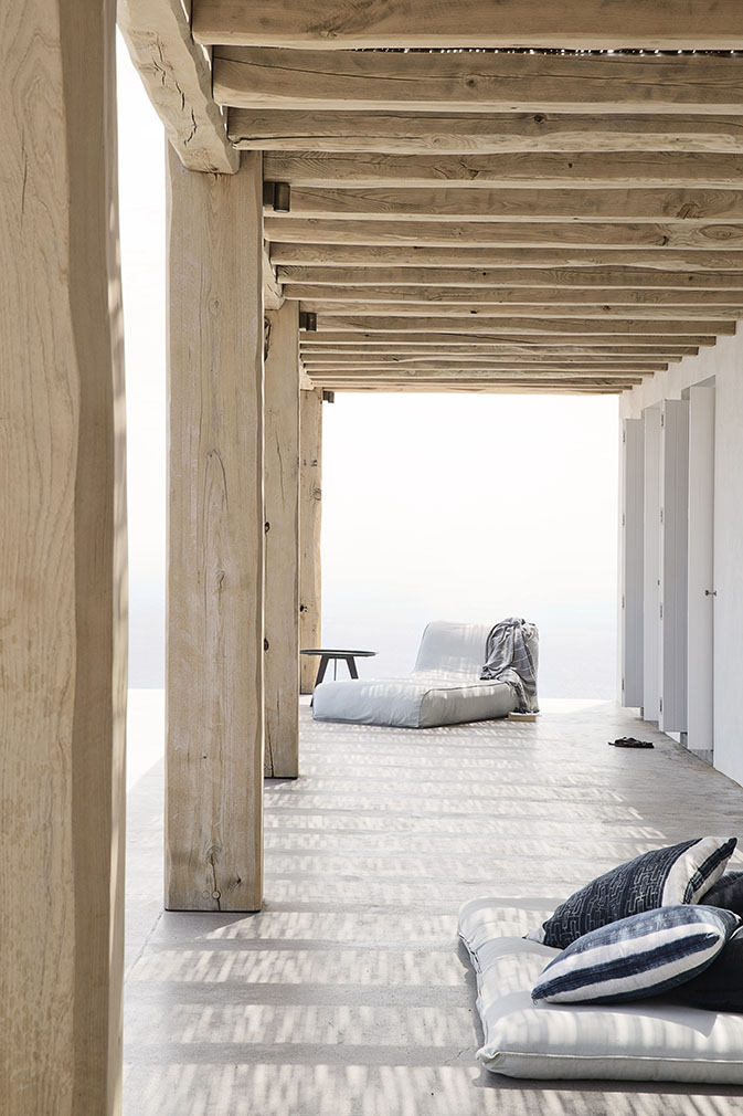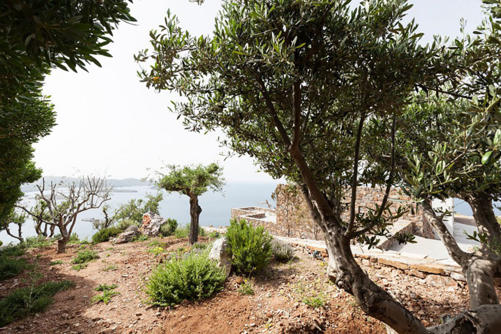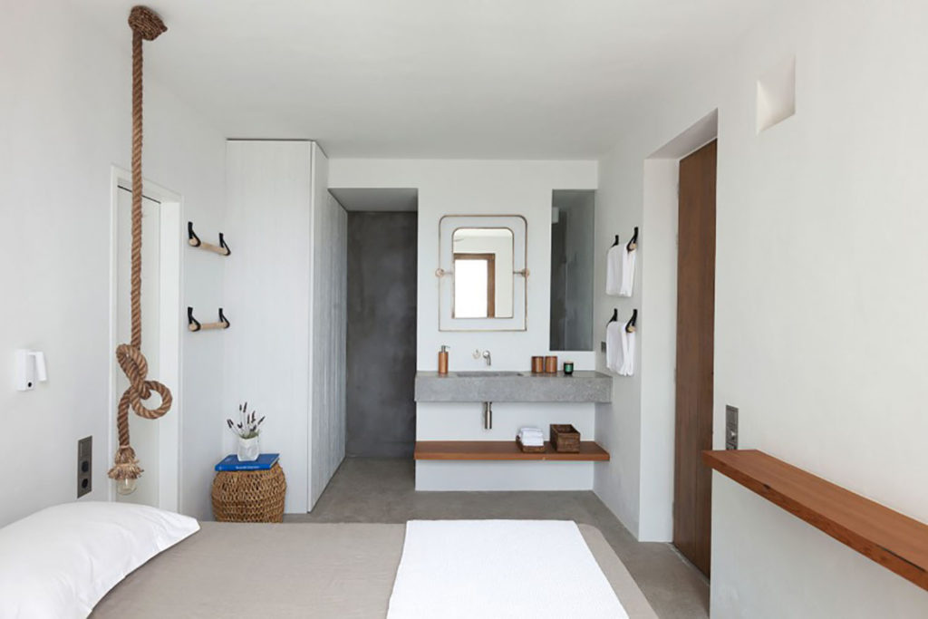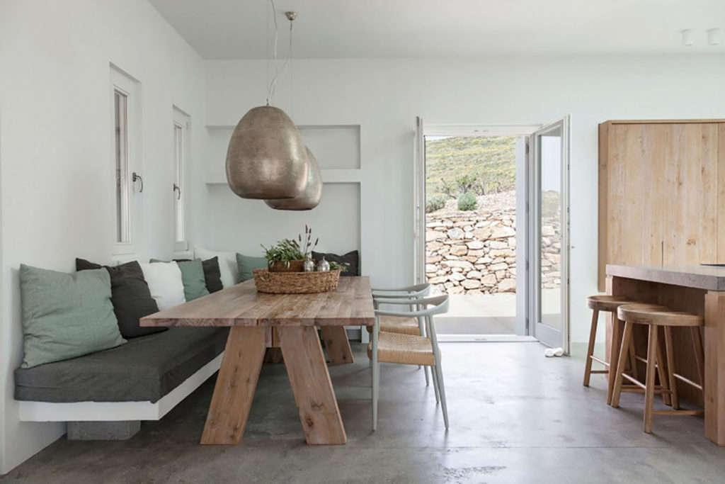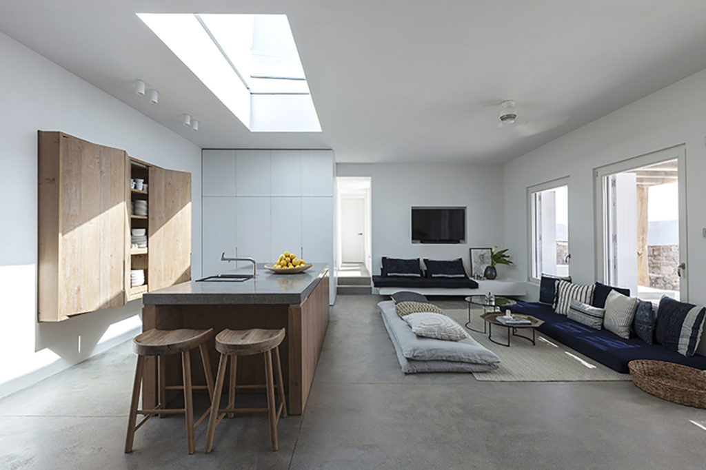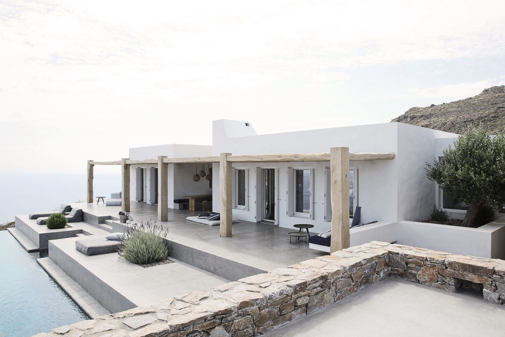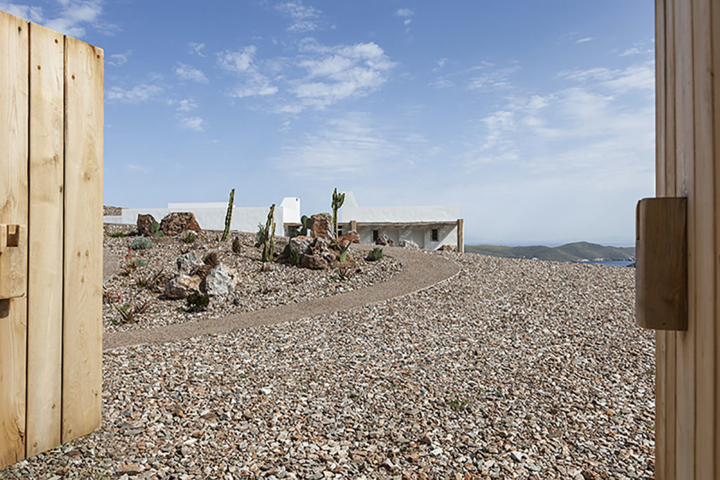 Rough cut stone, white walls and simple geometry define this contemporary Cycladic retreat on the Greek island of Syros.