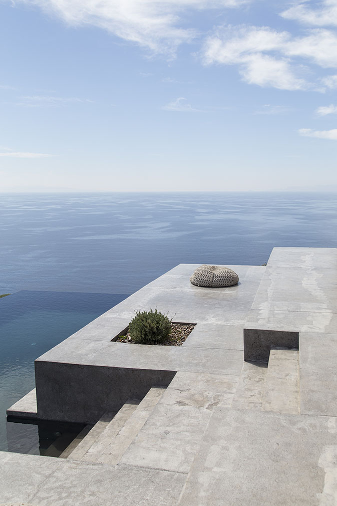 Athenian architect Sotiris Tsergas and interior designer Katja Margaritoglou of Block 722 Architects designed the clifftop holiday home, which looks out across the Aegean Sea from its stepped terraces and boxy windows.