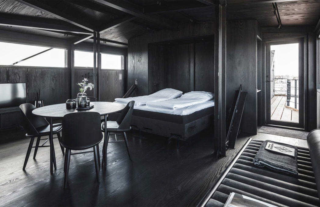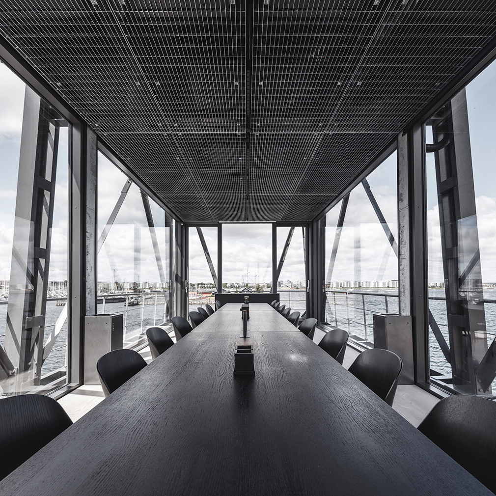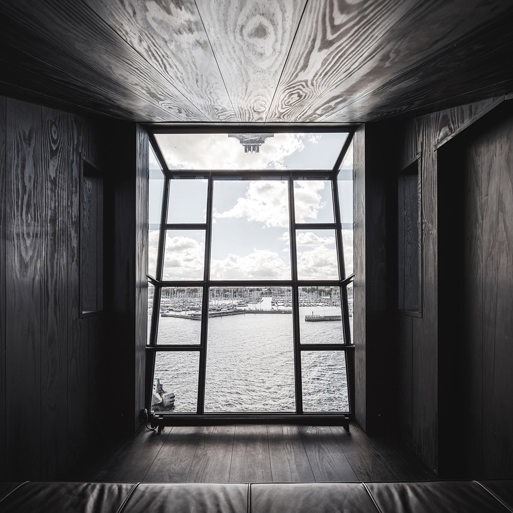 A former coal crane has been turned into a moody waterside retreat in Copenhagen, complete with a spa and terrace.