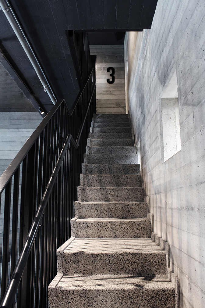 Although serving a utilitarian purpose the station, designed by Hans Christian Hansen in 1963, has a raw brutalist charm that’s been retained in the 31-room hotel following its adaptive reuse. The concrete building’s heritage-protected exterior facade has a grid of horizontal metal blades while inside cast concrete is left exposed along with concrete floors and original terrazzo stairs.