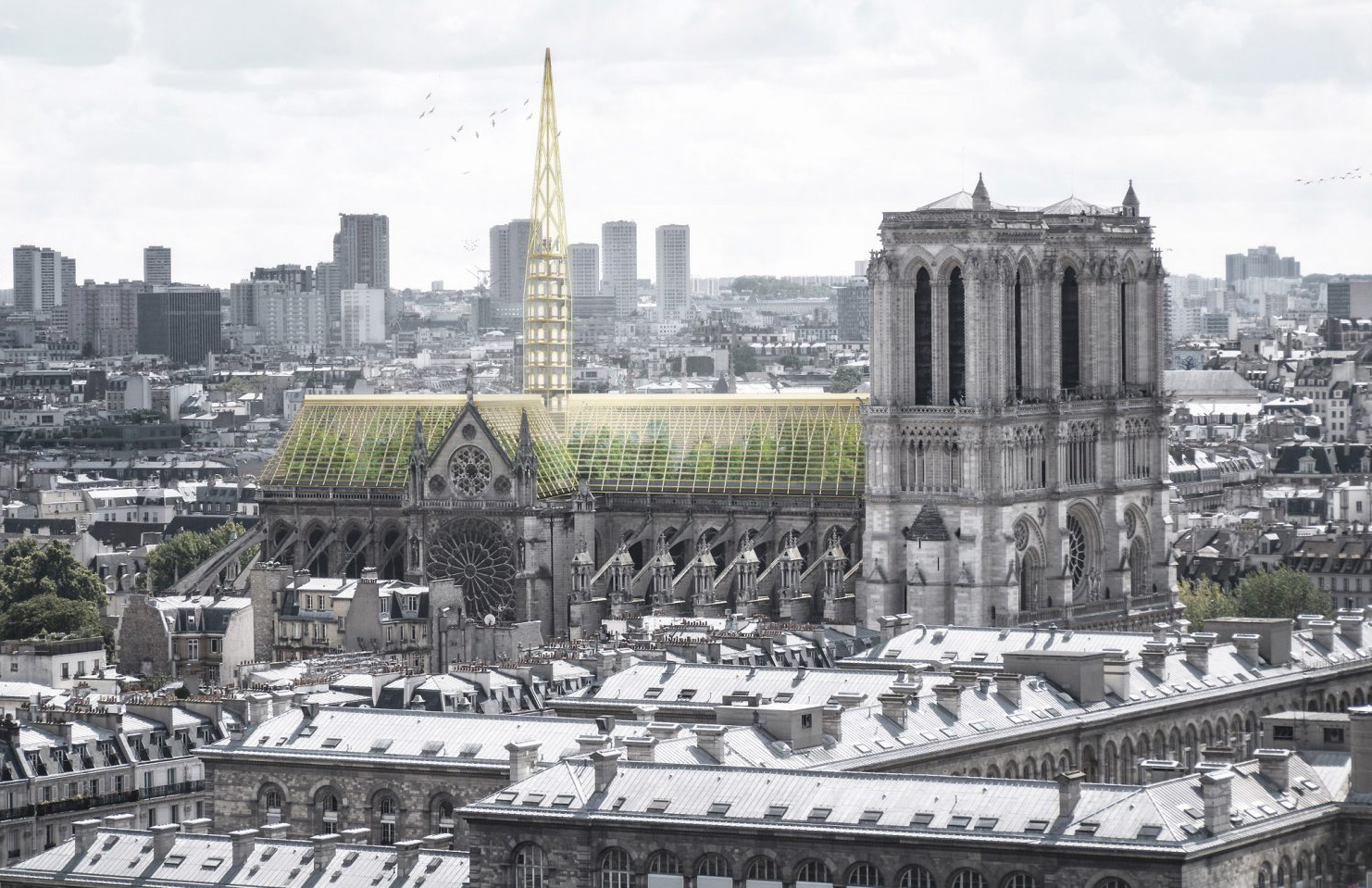 Other designs proposed for the landmark’s new roof include a sci-fi glass spike by Foster + Partners; a glowing Baccarat crystal roof and spire by Studio Fuksas; and gilded ‘flame’ from designer Mathieu Lehanneur.