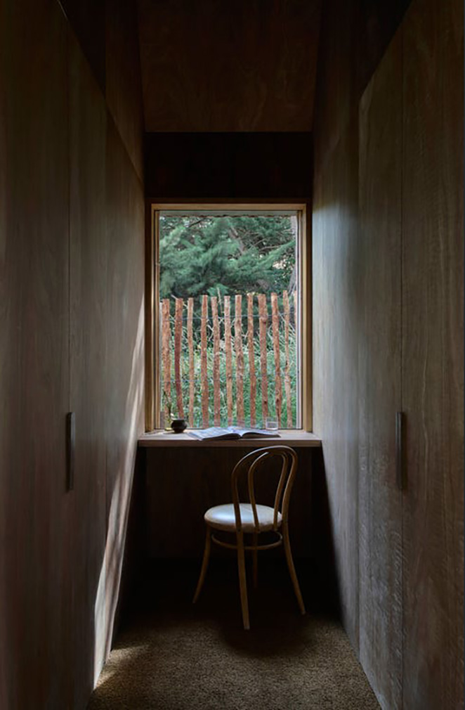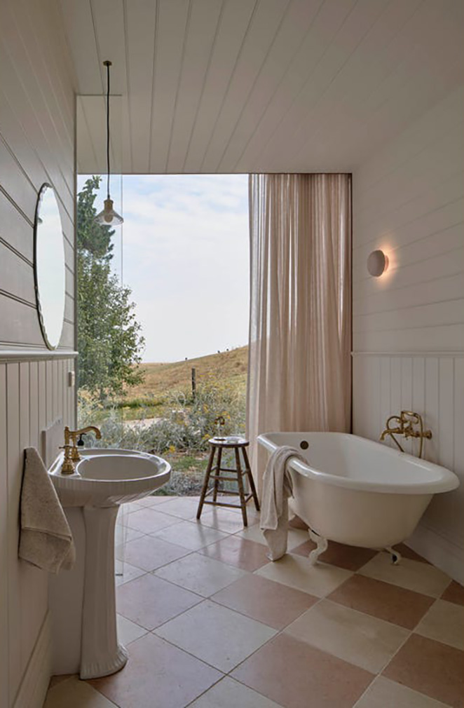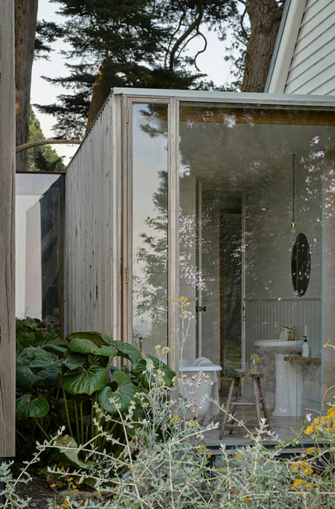 The extension introduces a bedroom, bathroom and smaller adjoining rooms. The bathroom combines a clawfoot bath and limestone finishes with a full-height window facing the landscape. The bedroom is lined in spotted gum, with a separate area used for reading or work.