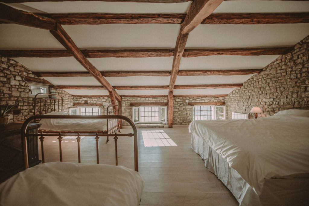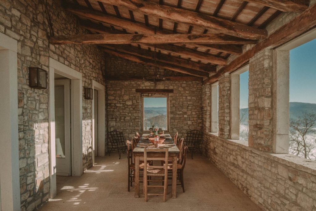Raftered beams and rugged stone walls create a cosy atmosphere inside this Croatian retreat on the country’s heart-shaped Istria peninsula.