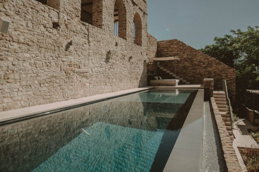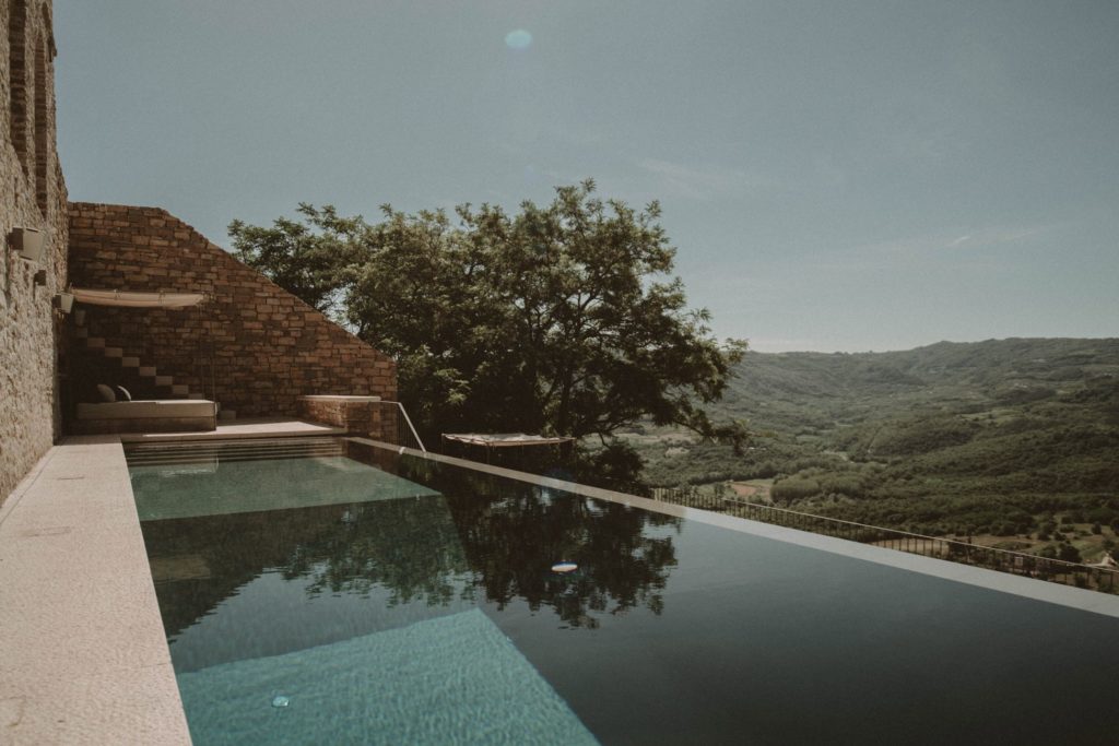 A separate entrance off the main street provides access to Villa Angelo’s steam room, and British-style gardens cultivated by landscape designer Ben Wilson that tumble down the hillside. Guests can also take a dip in the villa’s startling 14-metre infinity pool, which peeks over the surrounding Istrian countryside.