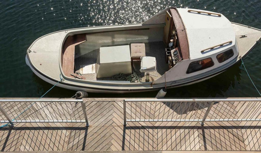 Set over two levels, the houseboat unfurls like a treehouse with a large living room on the lower floor, complete with a modern wood burning stove, parquet flooring and tall glass windows and doors that make the most of its harbour views.