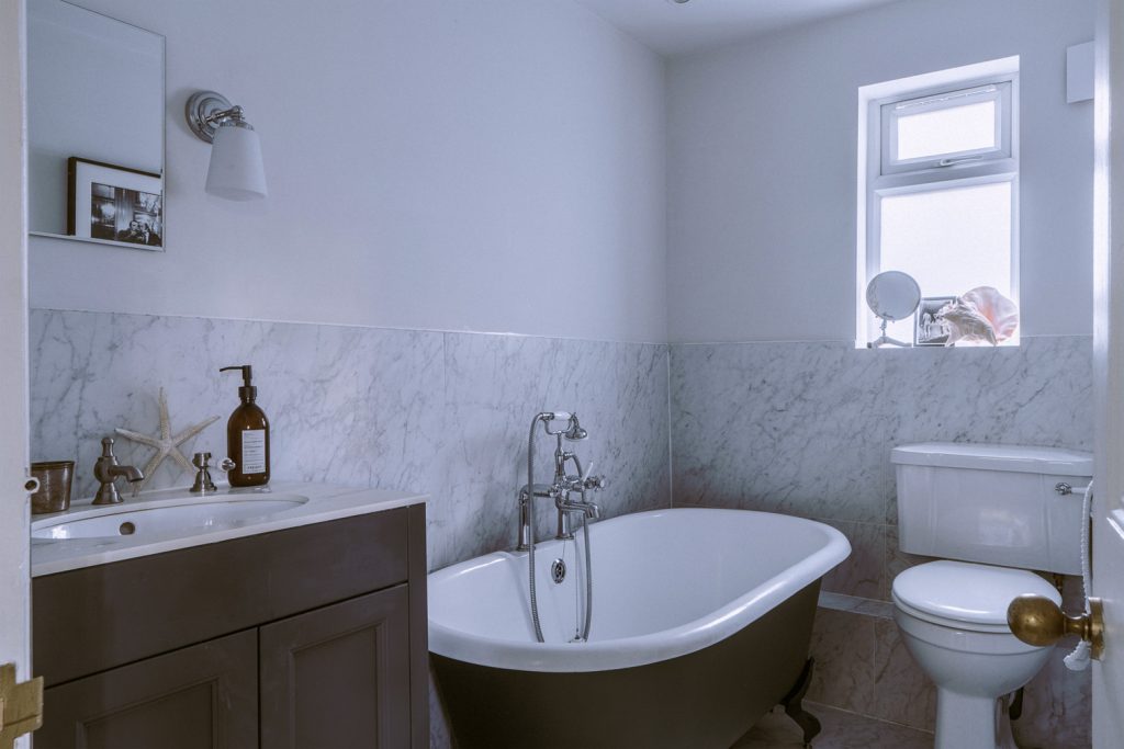 The kitchen is custom, with all-white cabinetry, Carrara marble worktops and open-faced shelving brimming with crockery and glassware.