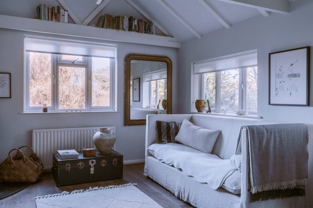 The Harringay building was formerly an old bakery, and the 419 sq ft studio flat is located at the top of the space, with its open-plan living spaces set beneath the exposed rafters. Windows run along three sides, and everything has been white-washed to amplify the feeling of light and volume.