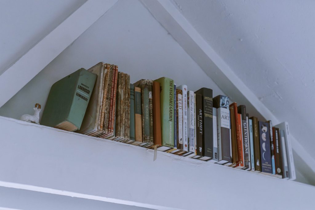 Books also inject colour into the minimalist space and are stacked on shelves and along the top of the window beams.