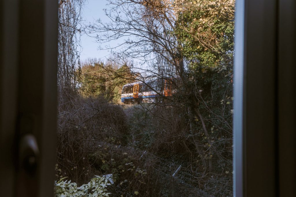 Located through a private gate tucked along a terrace of shops and houses, the entrance leads into a peaceful courtyard garden where metal stairs ascend to the flat’s front door, surrounded by jasmine and climbing roses.