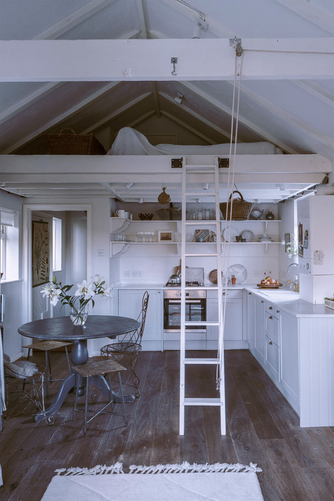There’s a separate bathroom with a rolltop bathtub, but the bedroom is a sleeping area located beneath the apex of the roof. Above the kitchen, it’s accessed via a pulley-operated ladder that can be pulled up when not in use, leaving the living room floor to walk around.